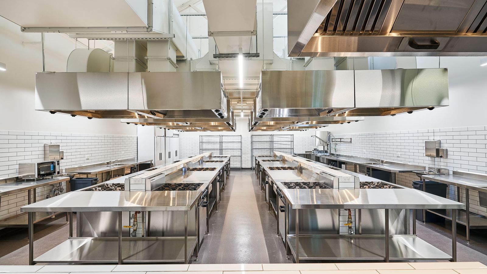 An extensive exhaust system was integrated into the high open ceilings utilising low-velocity hoods to accommodate the 16 cooking stations. Hiller designed the kitchen and supplied all the equipment including the custom benchwork – and with the help of fastidious planning pre-ordered and fabricated all benching ahead of time, managing to reduce the kitchen fitout time for a completion of install over only 2 days.