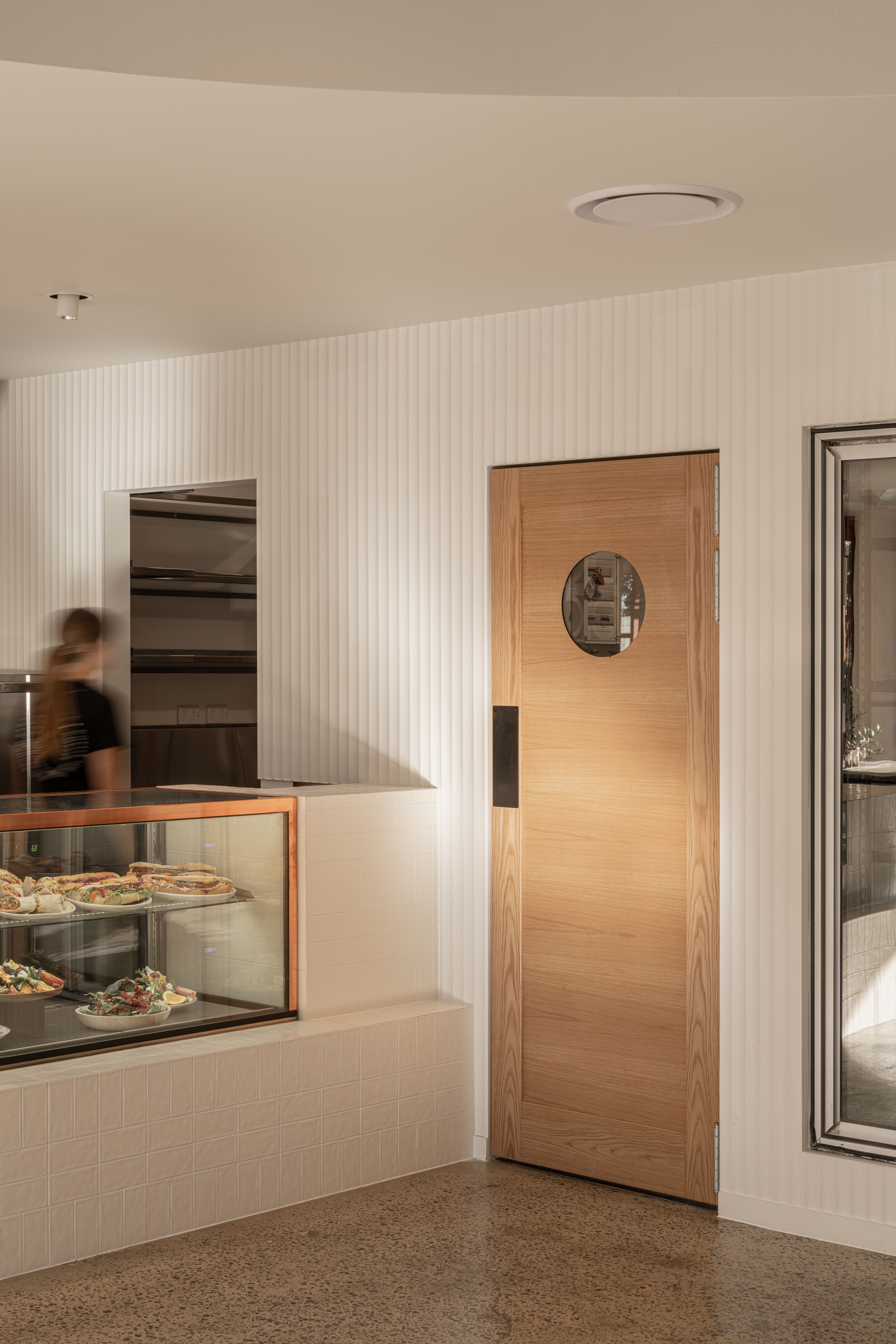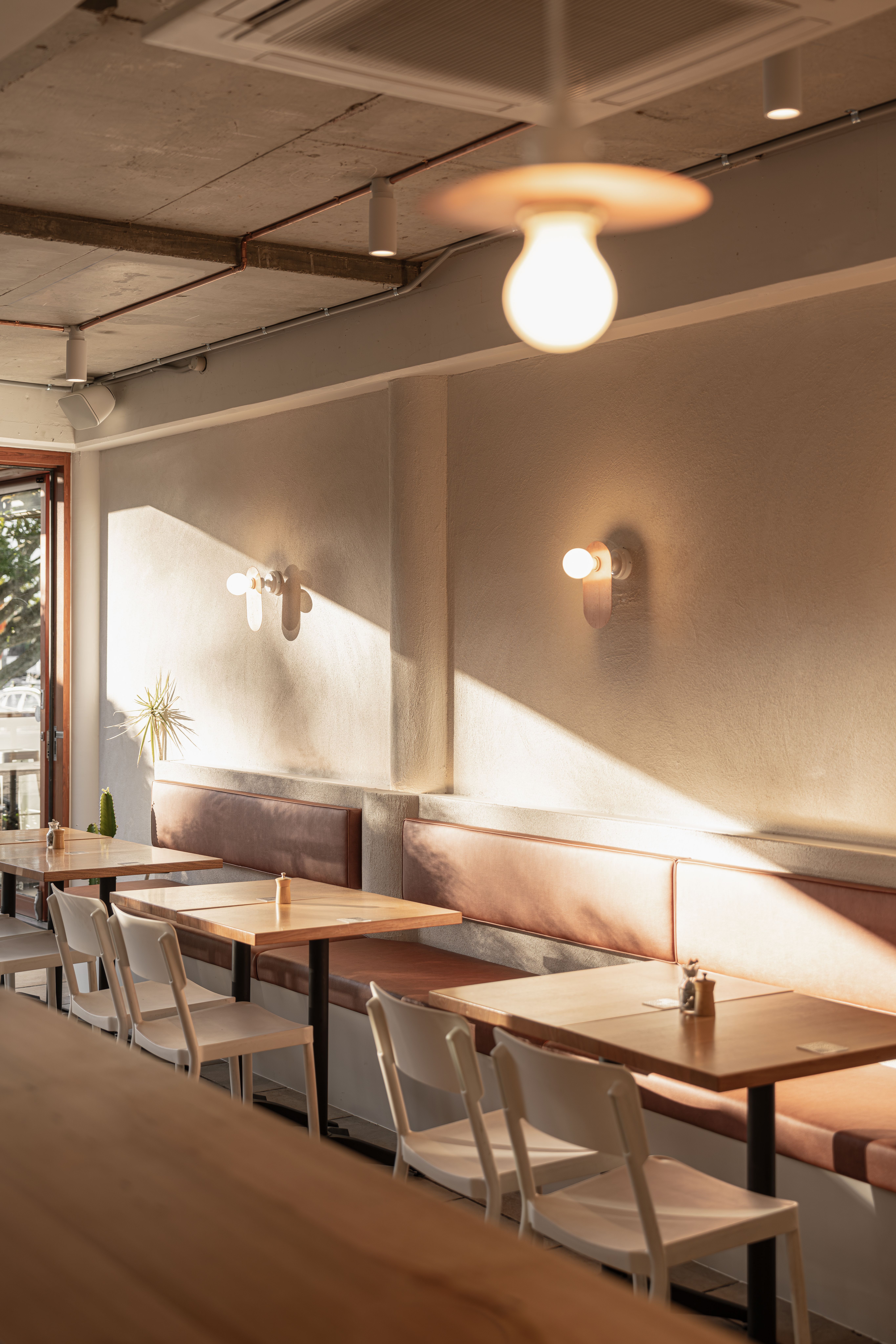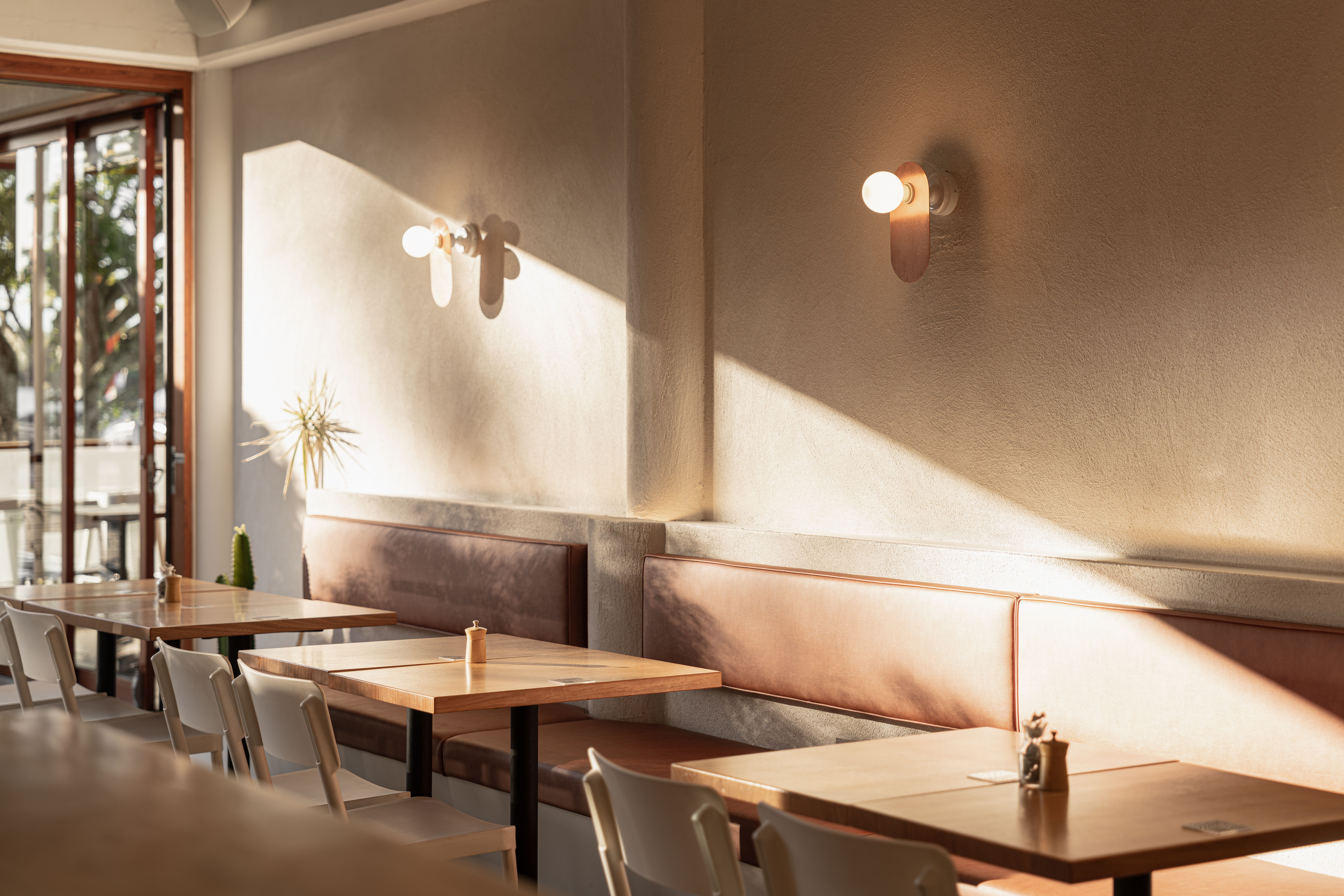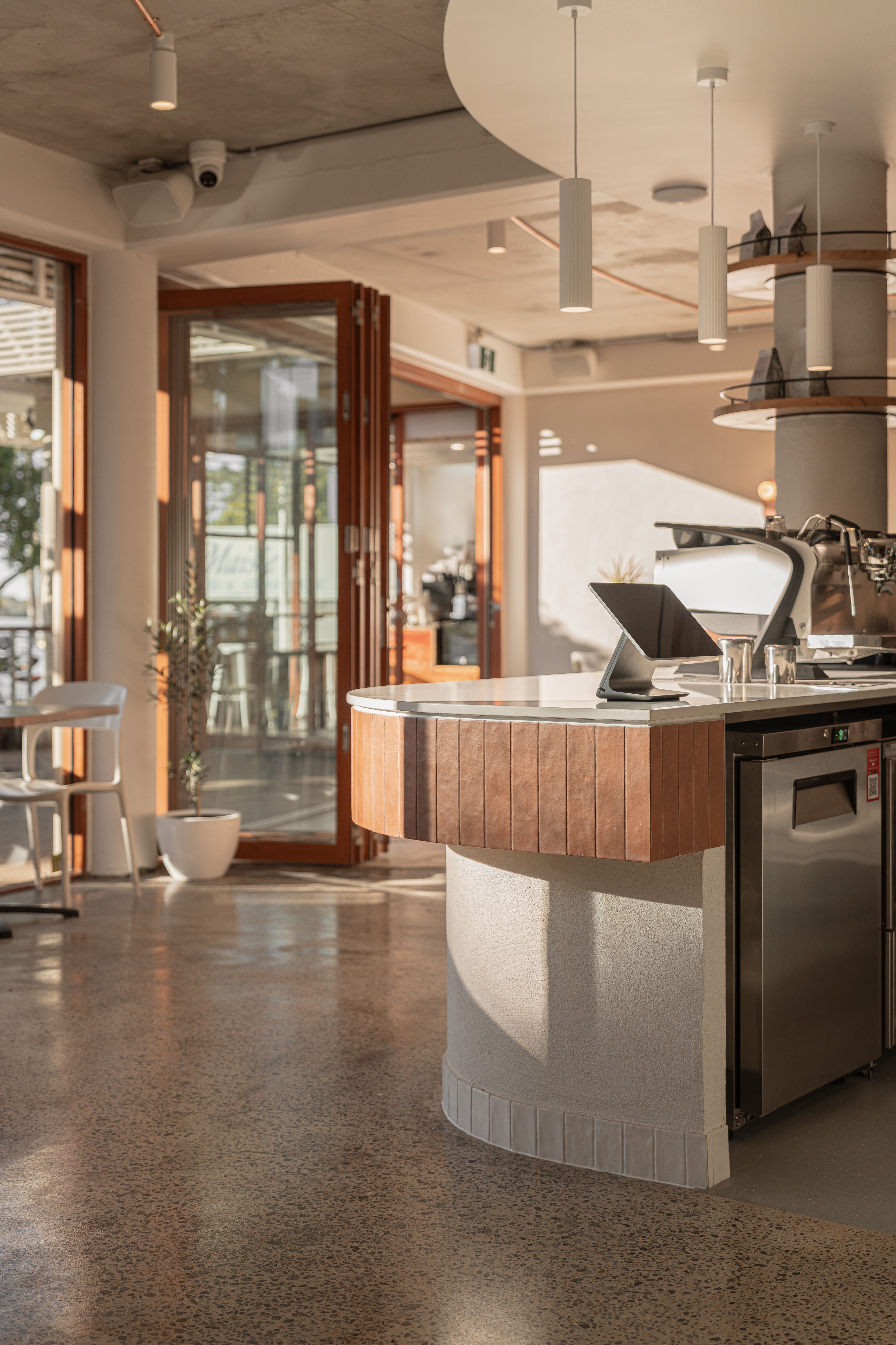 Banquette seating was re-wrapped and rotated along the wall catching the sun. The existing cafe curved bulkhead was not only kept, but extended into adjacent tenancy to tie cafe and takeaway space to the bar and dining.