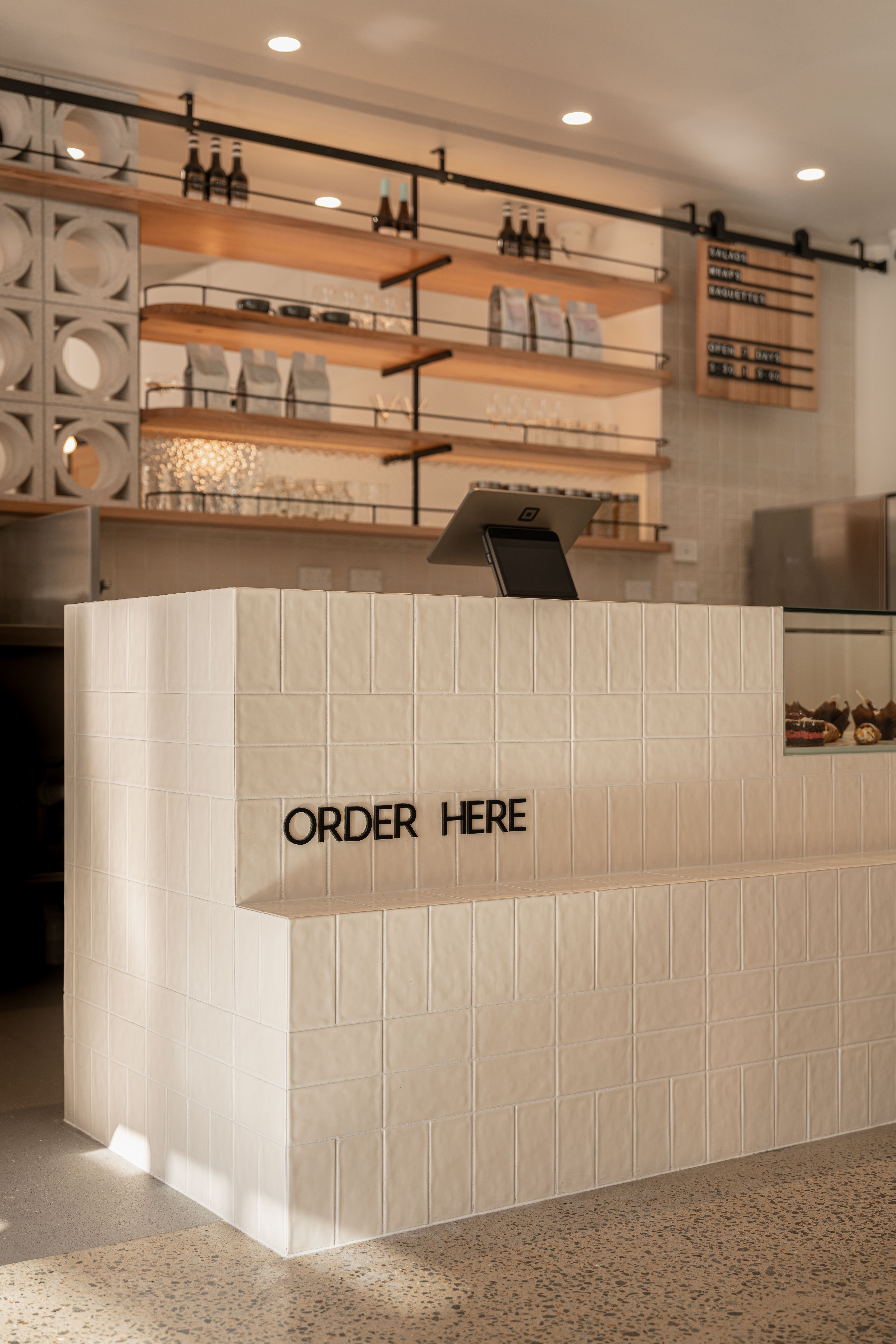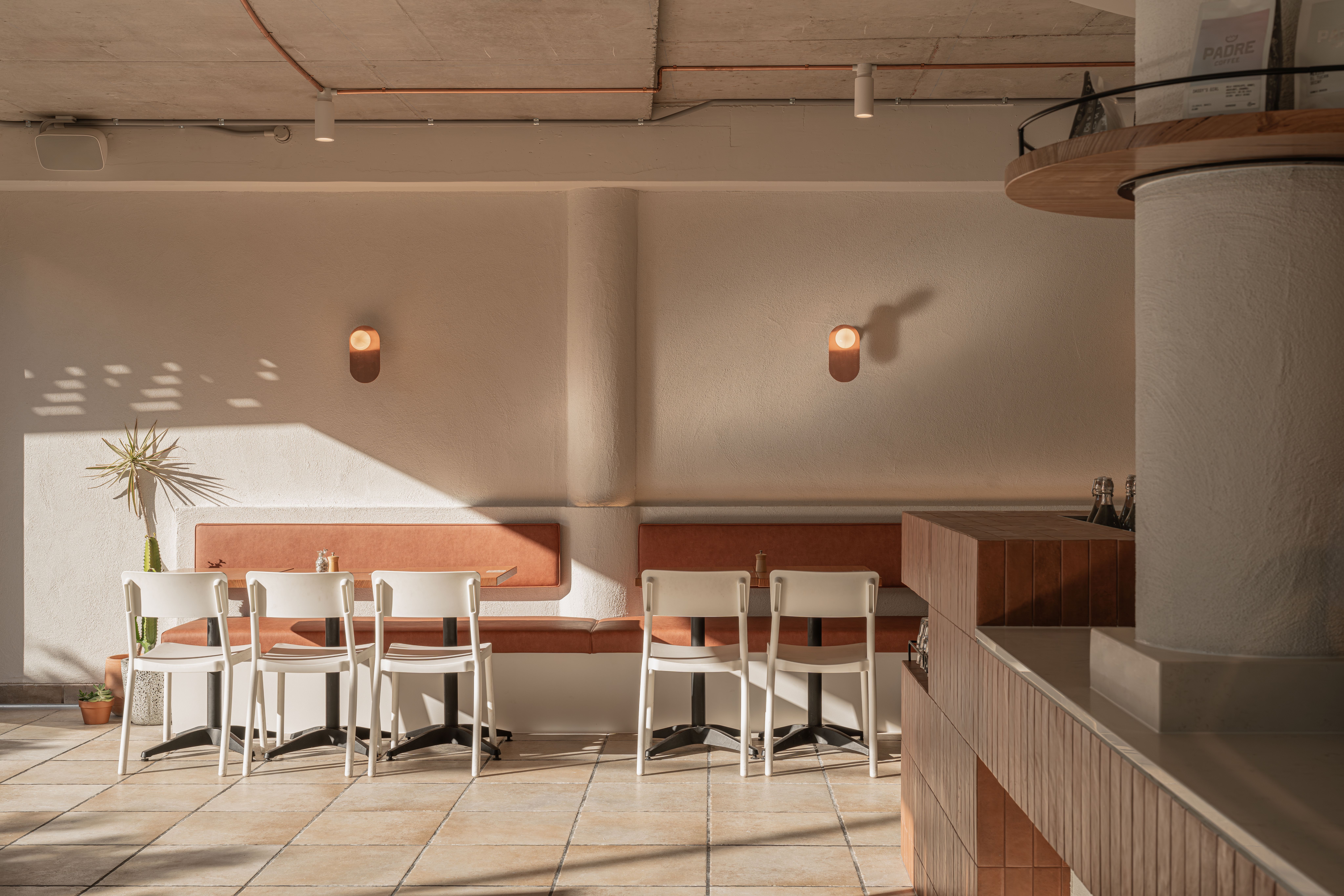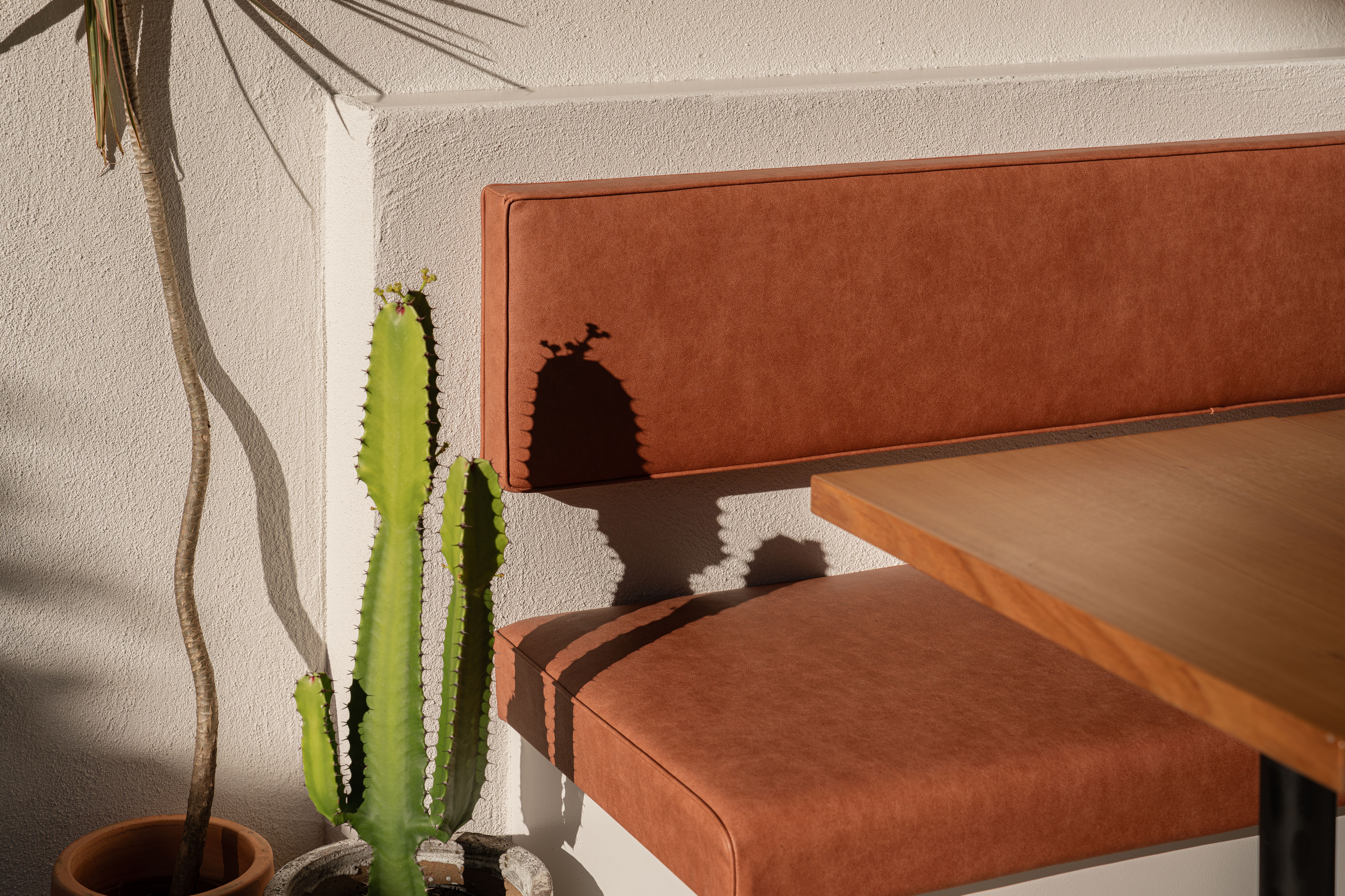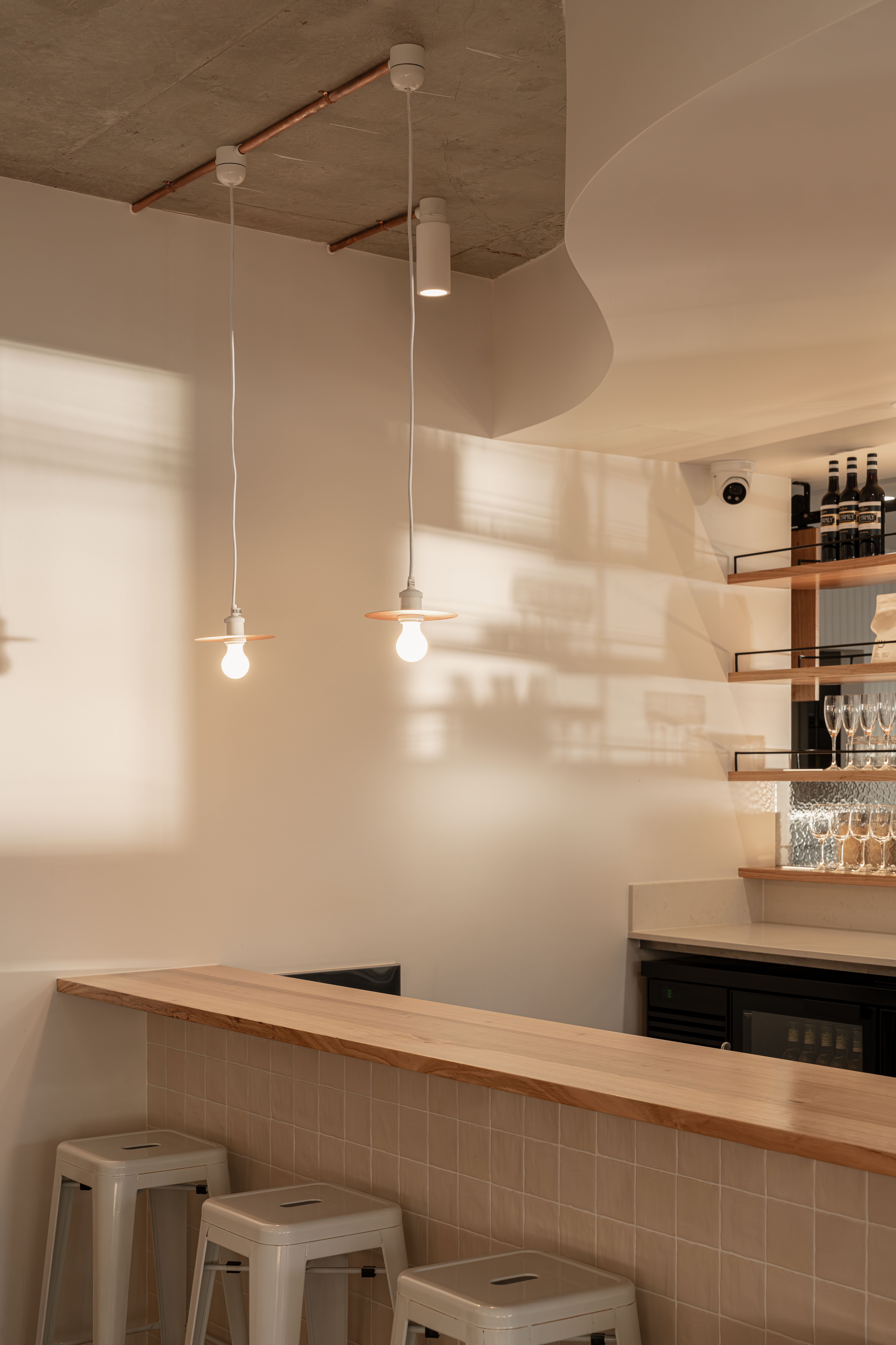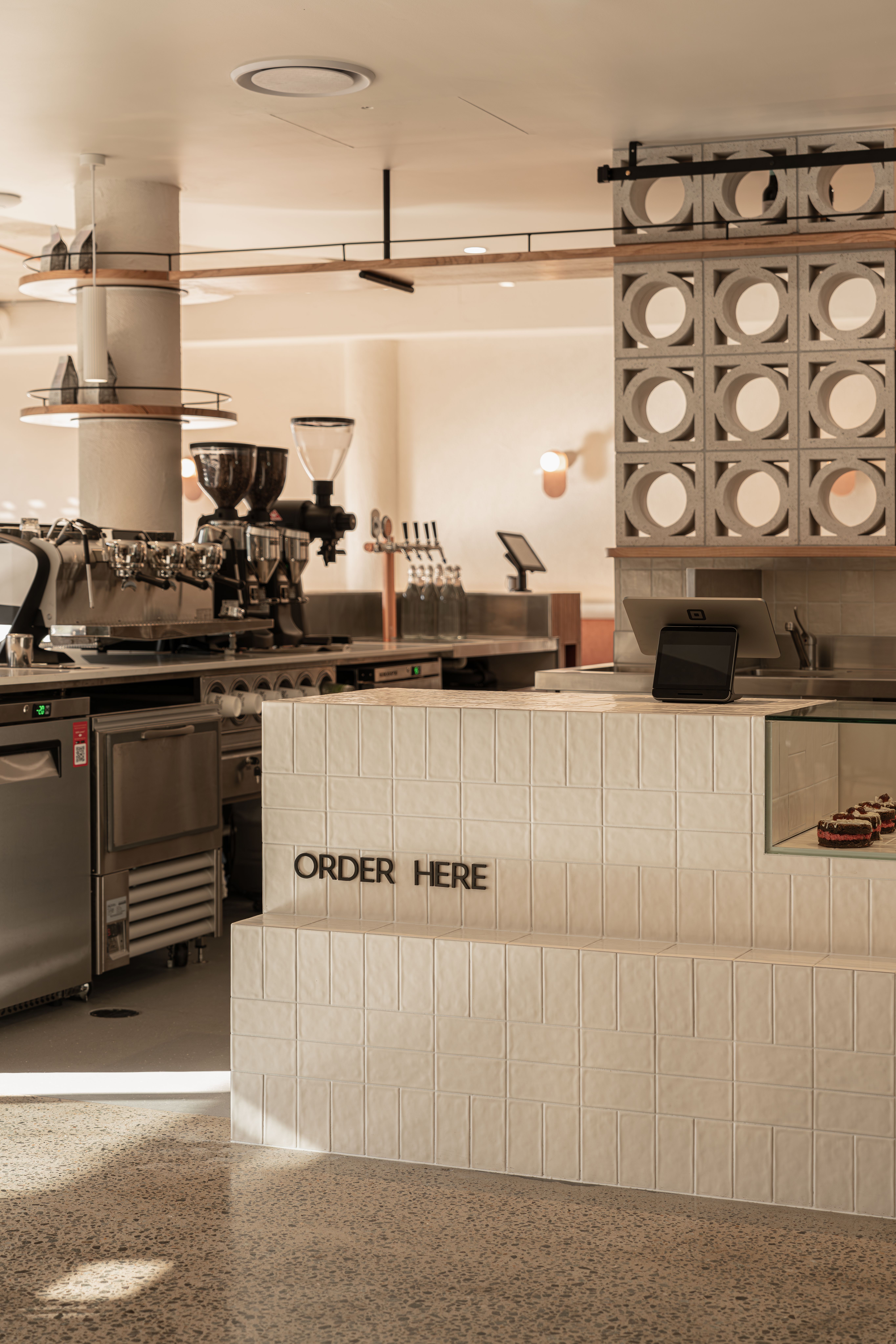 Banquette seating was re-wrapped and rotated along the wall catching the sun. The existing cafe curved bulkhead was not only kept, but extended into adjacent tenancy to tie cafe and takeaway space to the bar and dining.