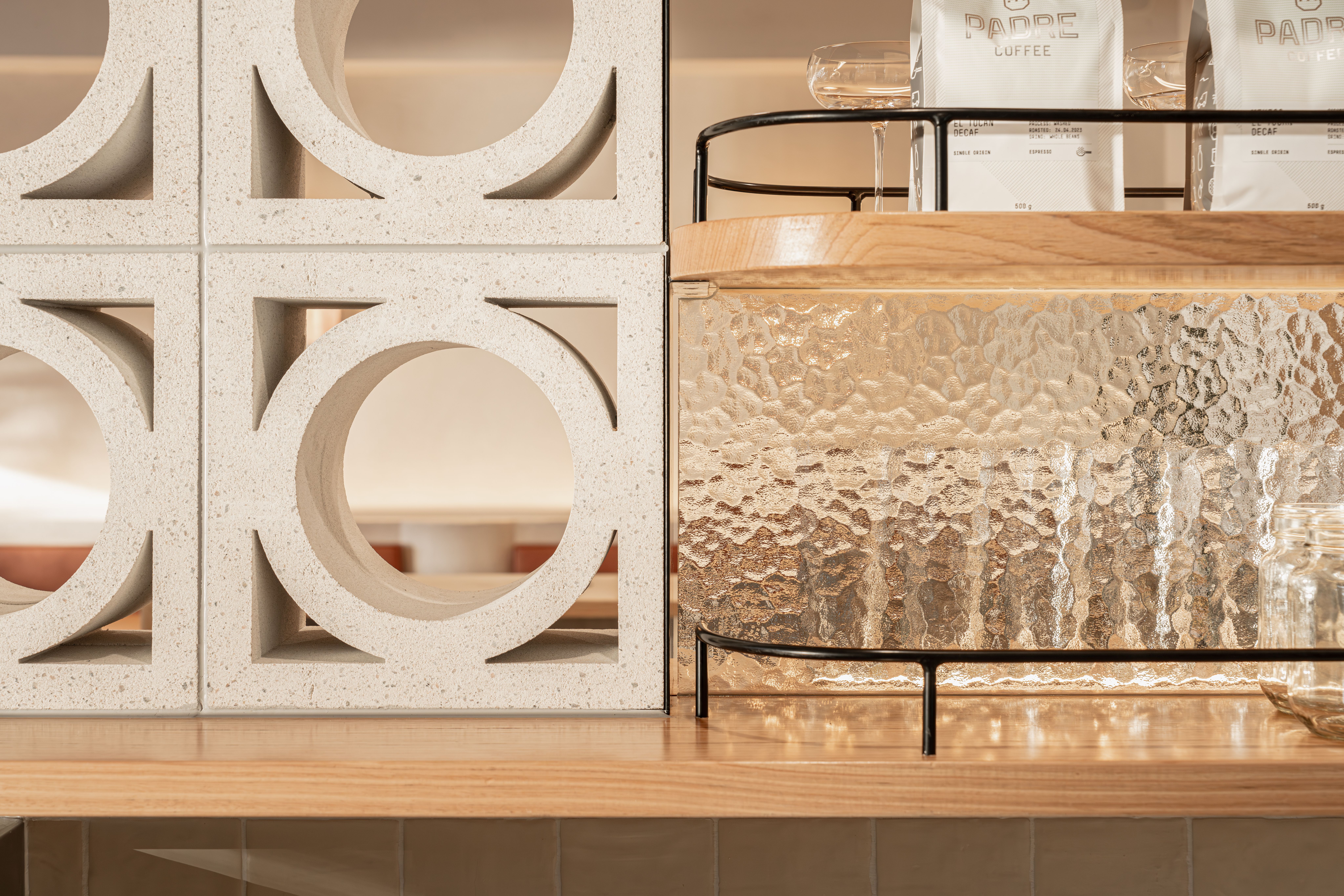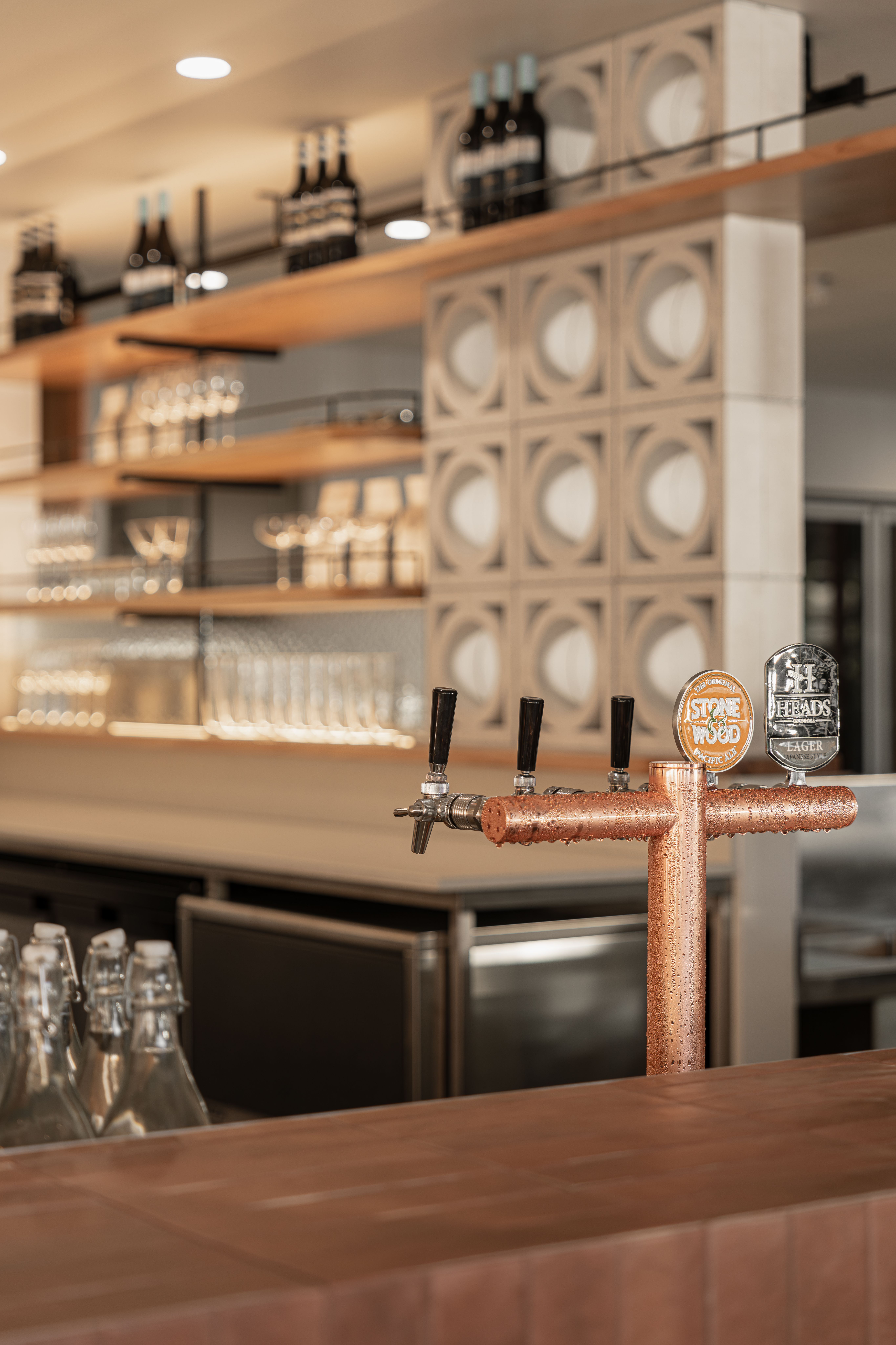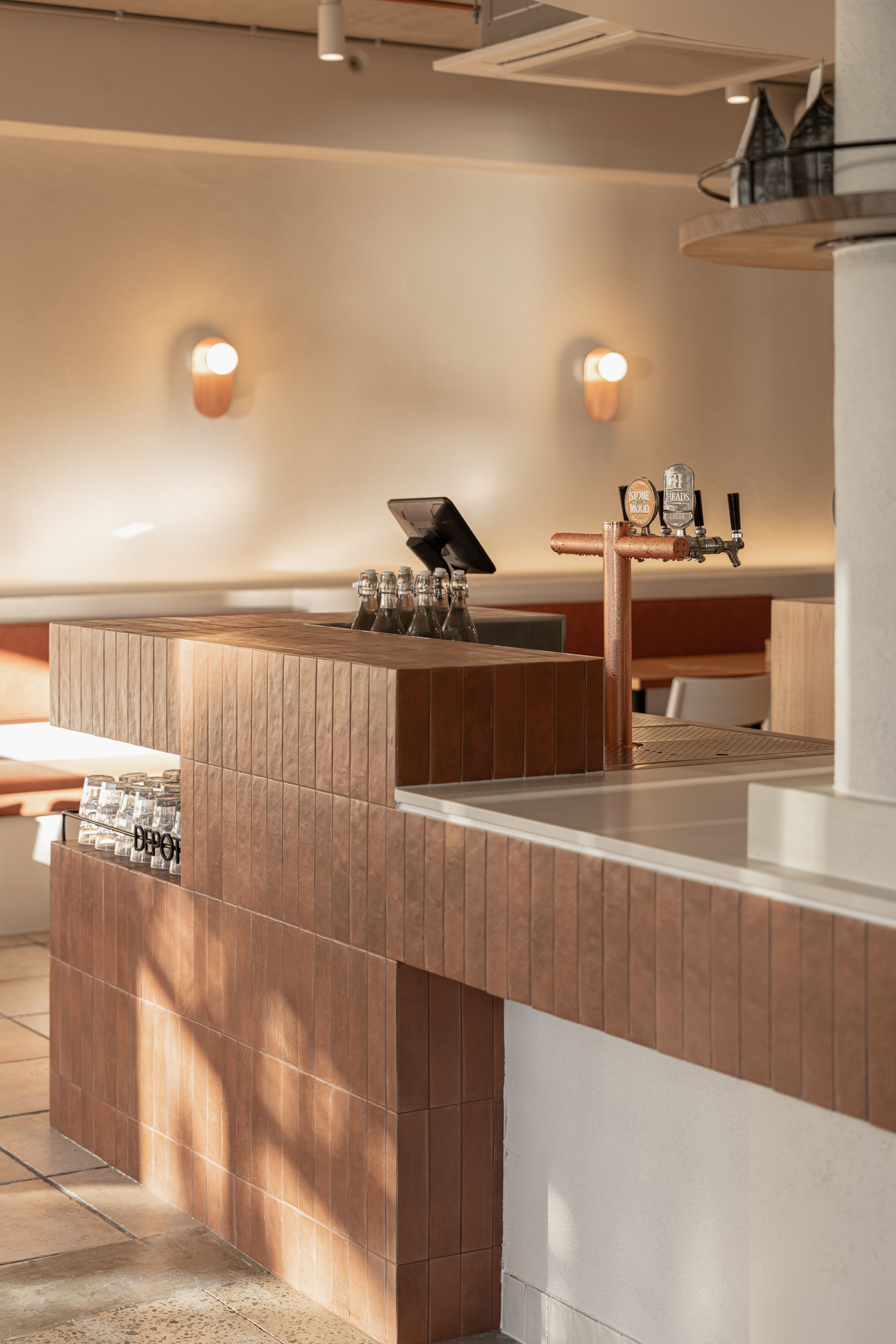 The bar, impressive 7-meter beverage line, and take-away order are all a linear continuation of the next, yet shapeshift in form and material as they progress through for effect of separation.