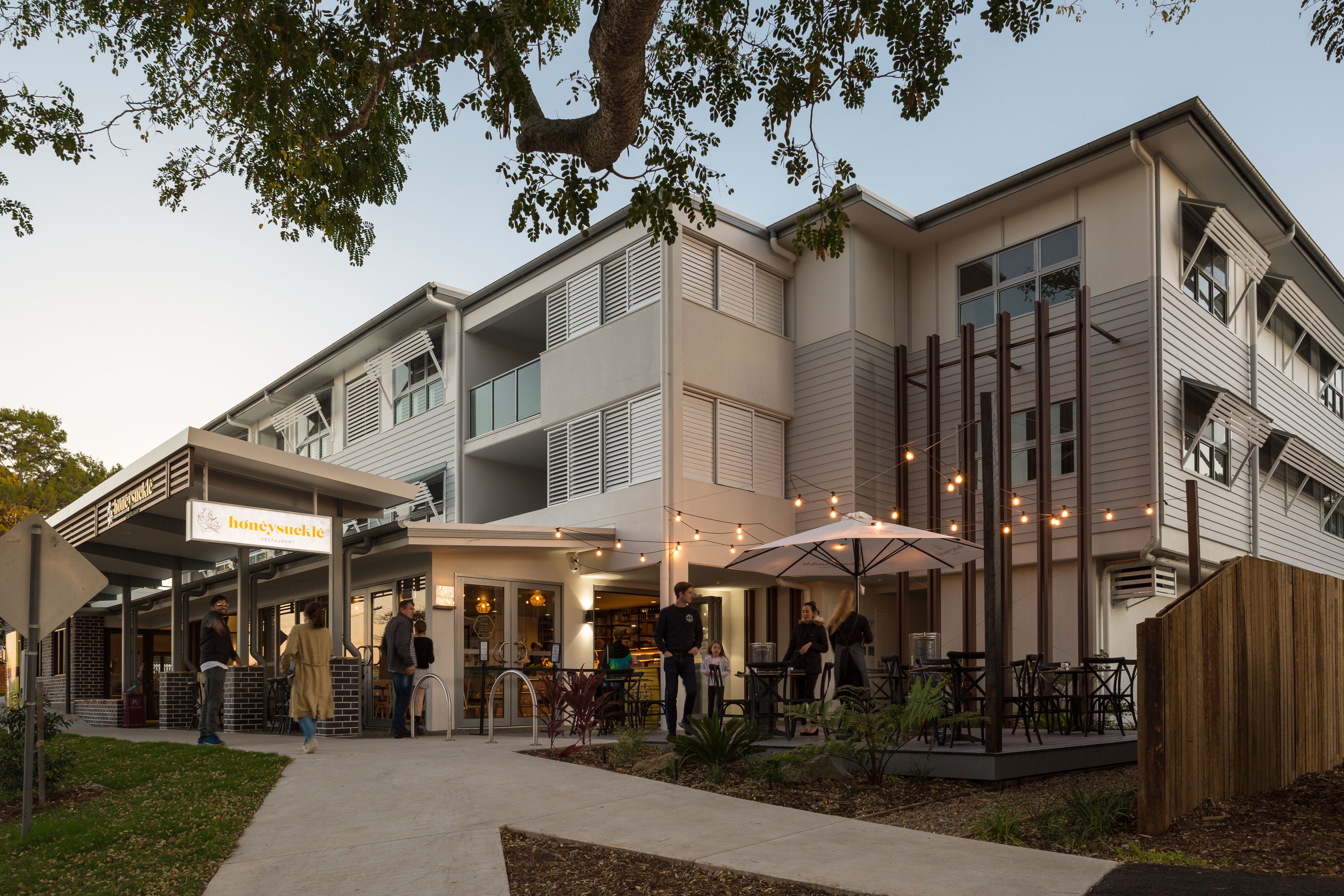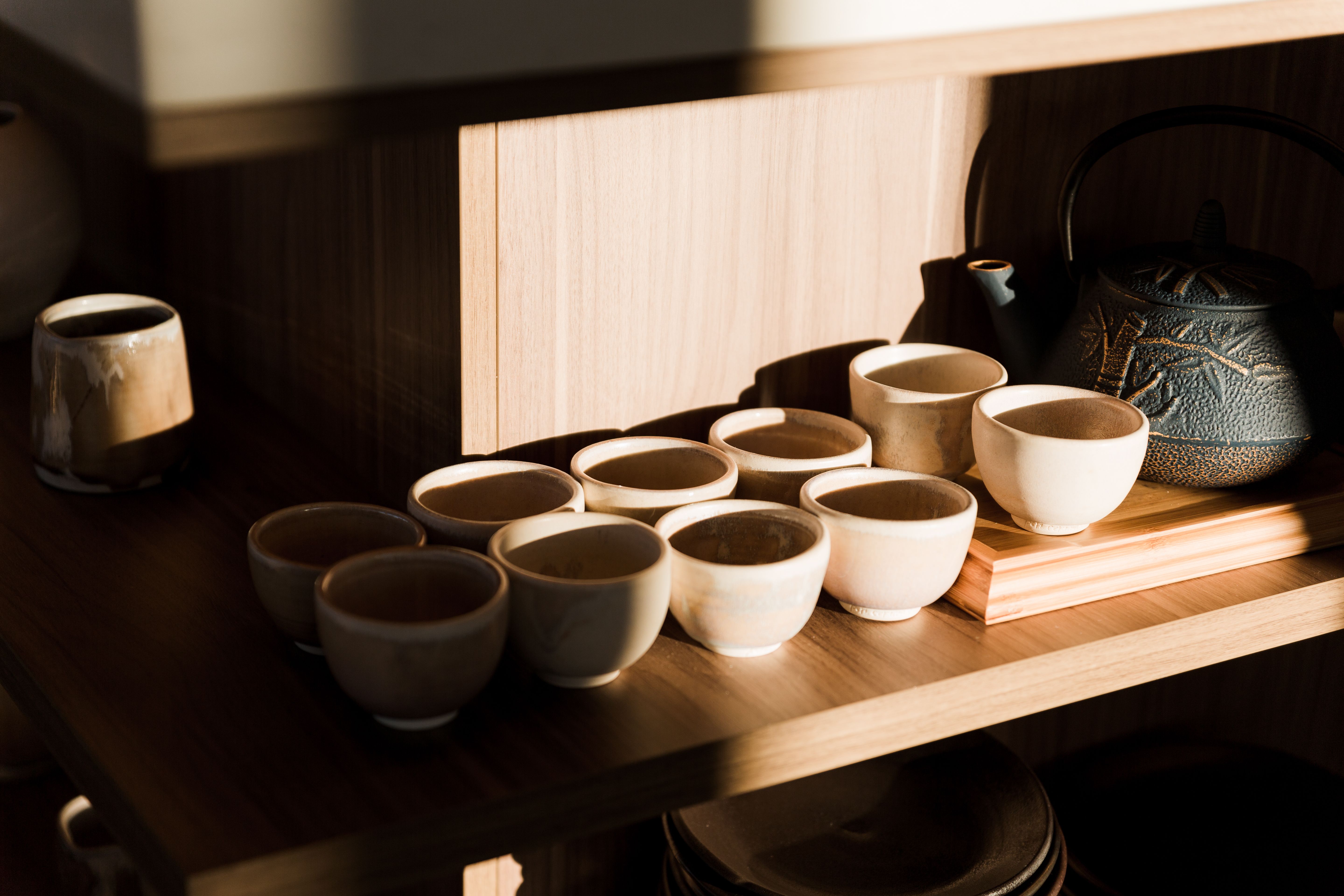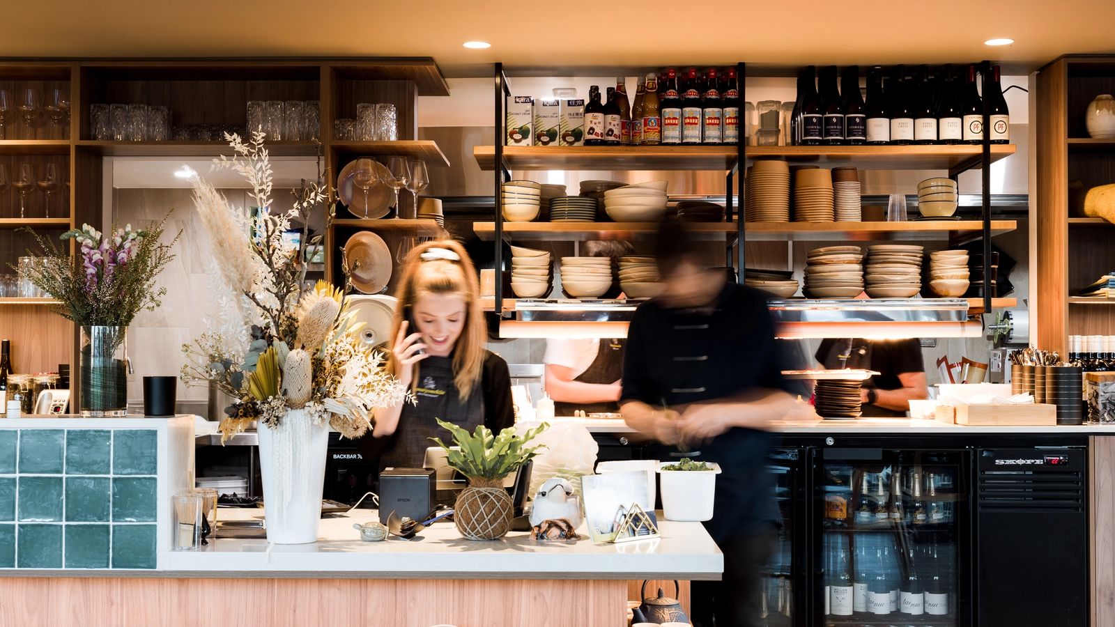 The tiled counter housing beverage and POS to rear, forms a screened walkway to the storeroom, past the opening through to the ever-so-efficient kitchen - a gap in the backbar shelving creating the doorway, and bench above the fridge forming the kitchen pass. The front recesses shelves carrying the locally crafted ceramic ware.