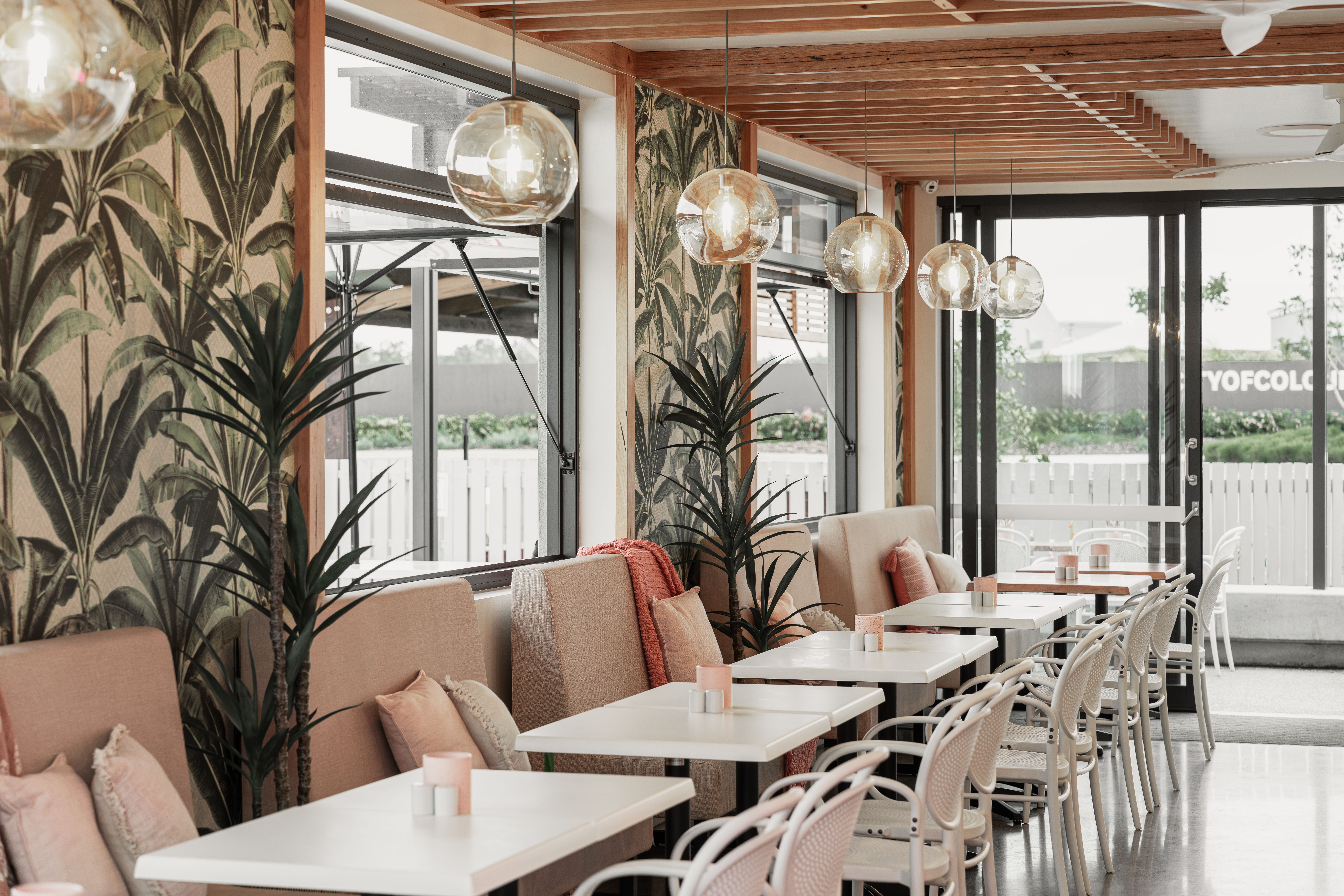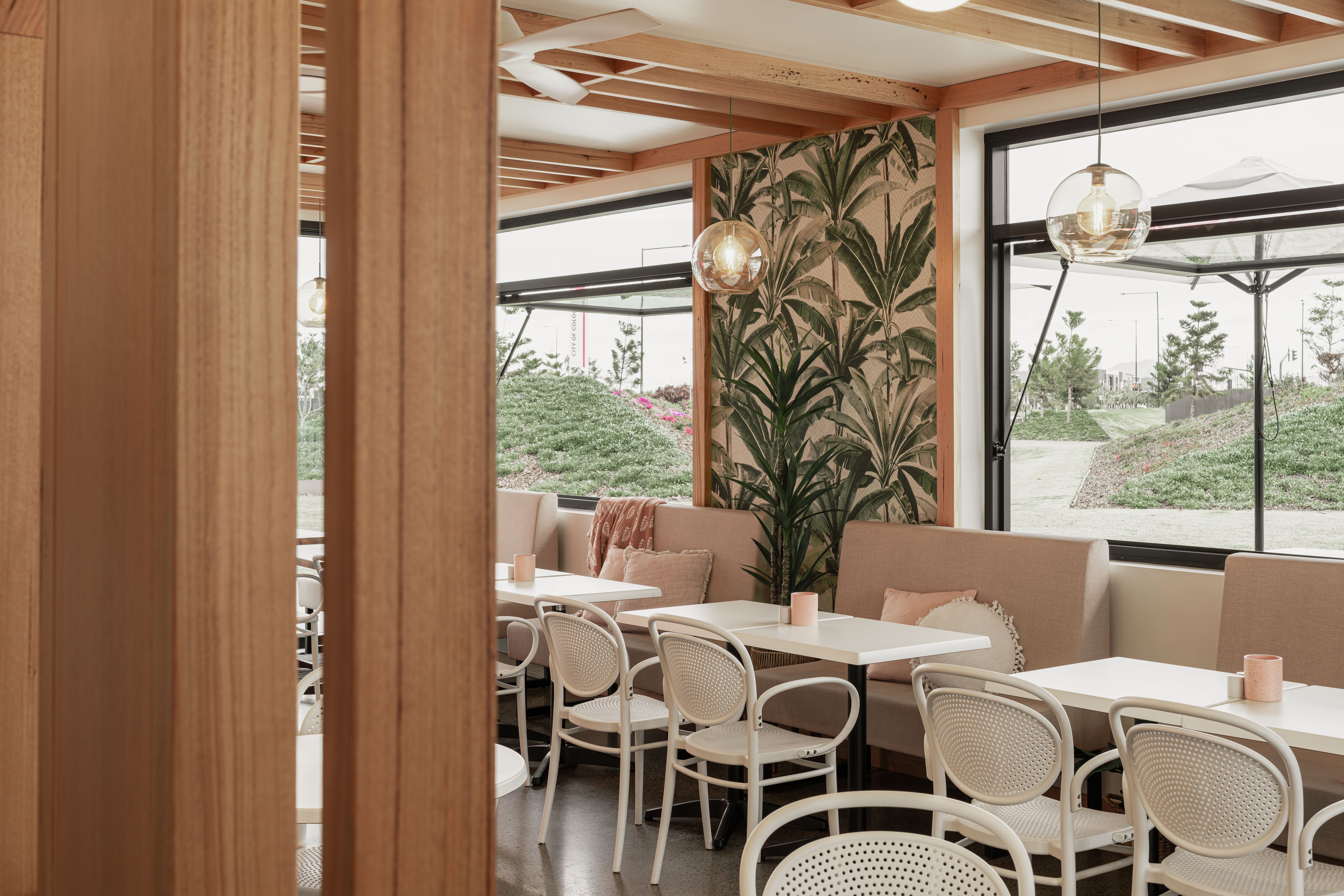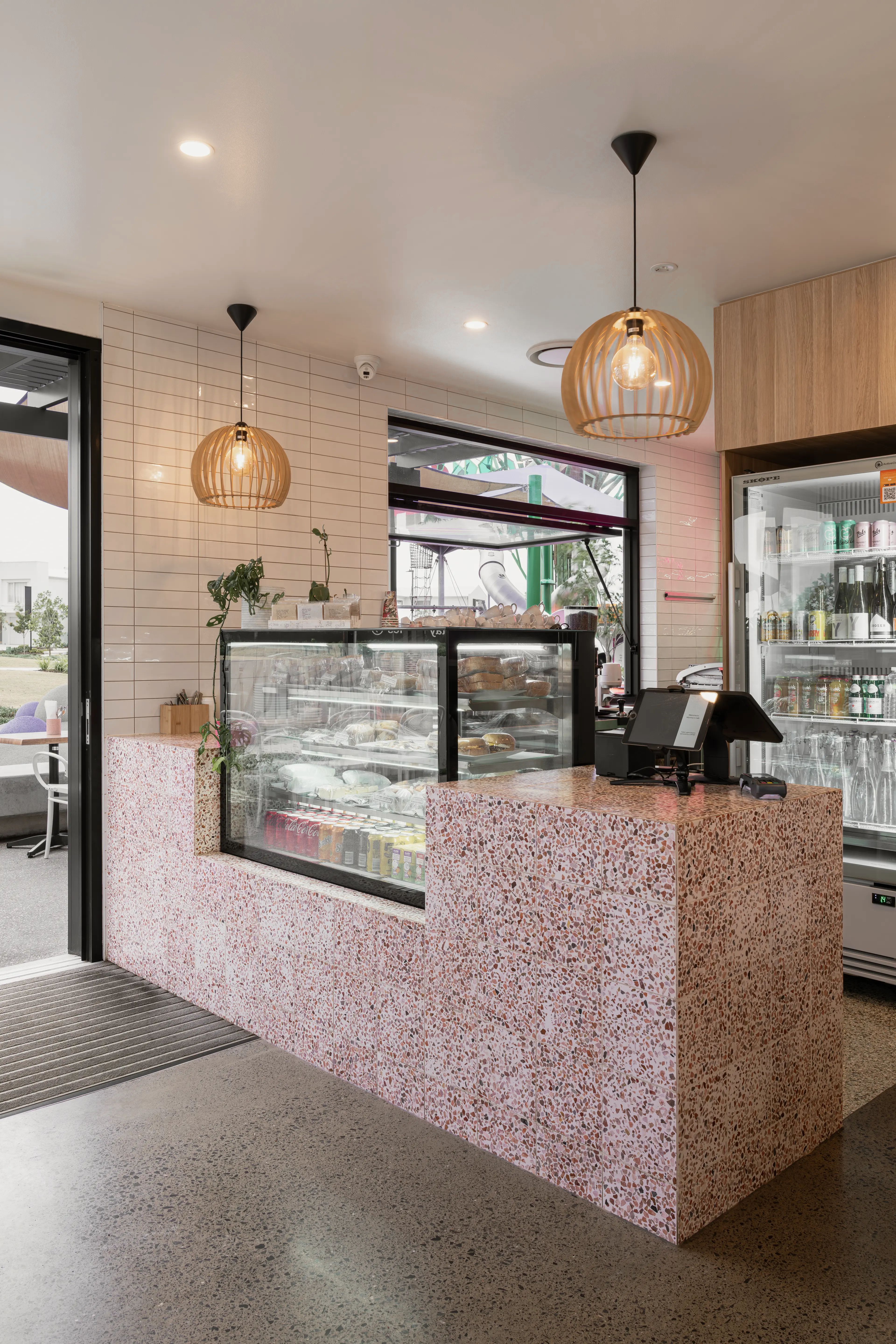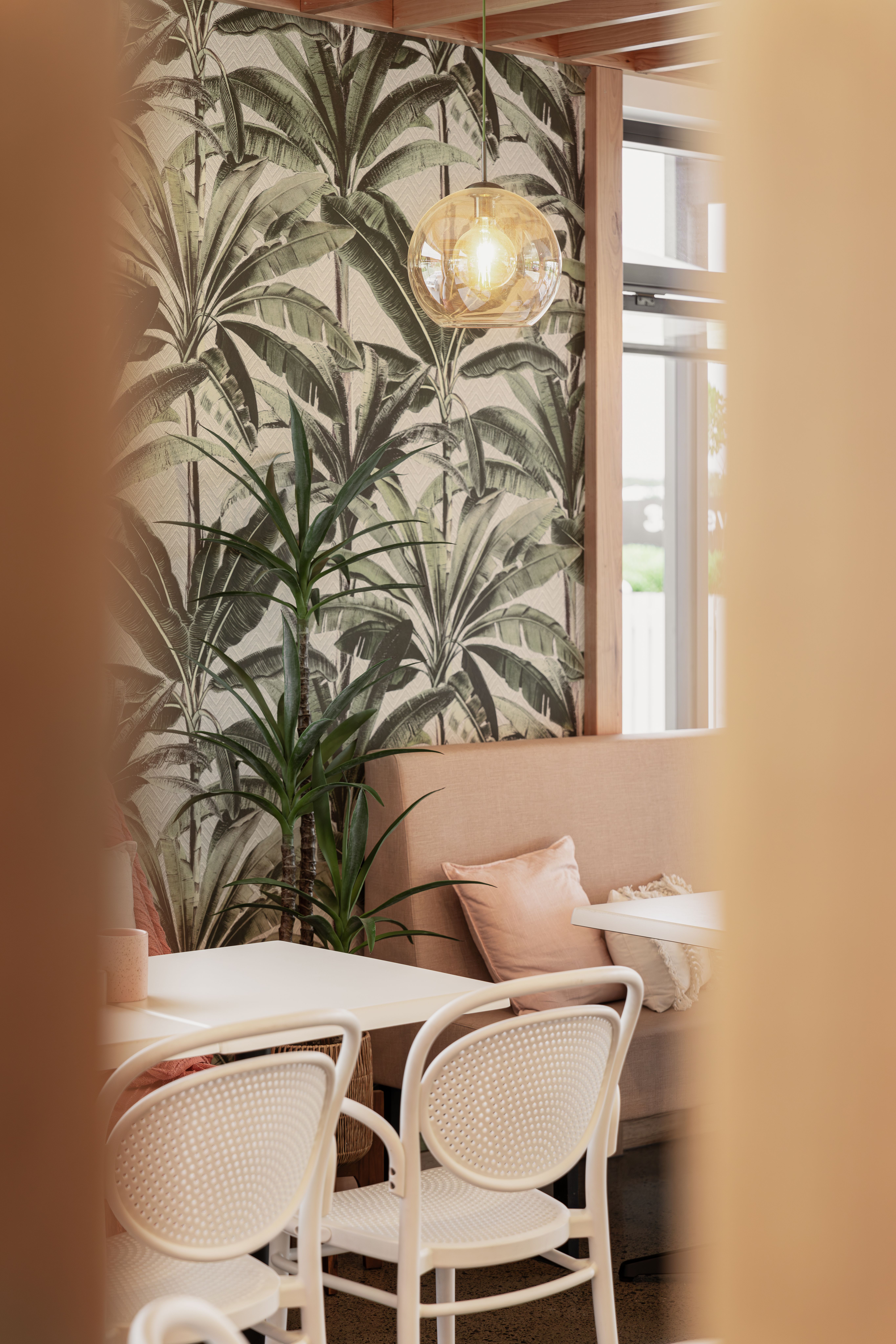The Mummy's colour palette was well communicated through a terrazzo counter, upholstery, and tropical wallpaper creates the perfect balance in achieving final effect of blush tones, blonde timbers and concrete surfaces supporting the light, airy and busy cafe venue for this fast-growing community to enjoy.