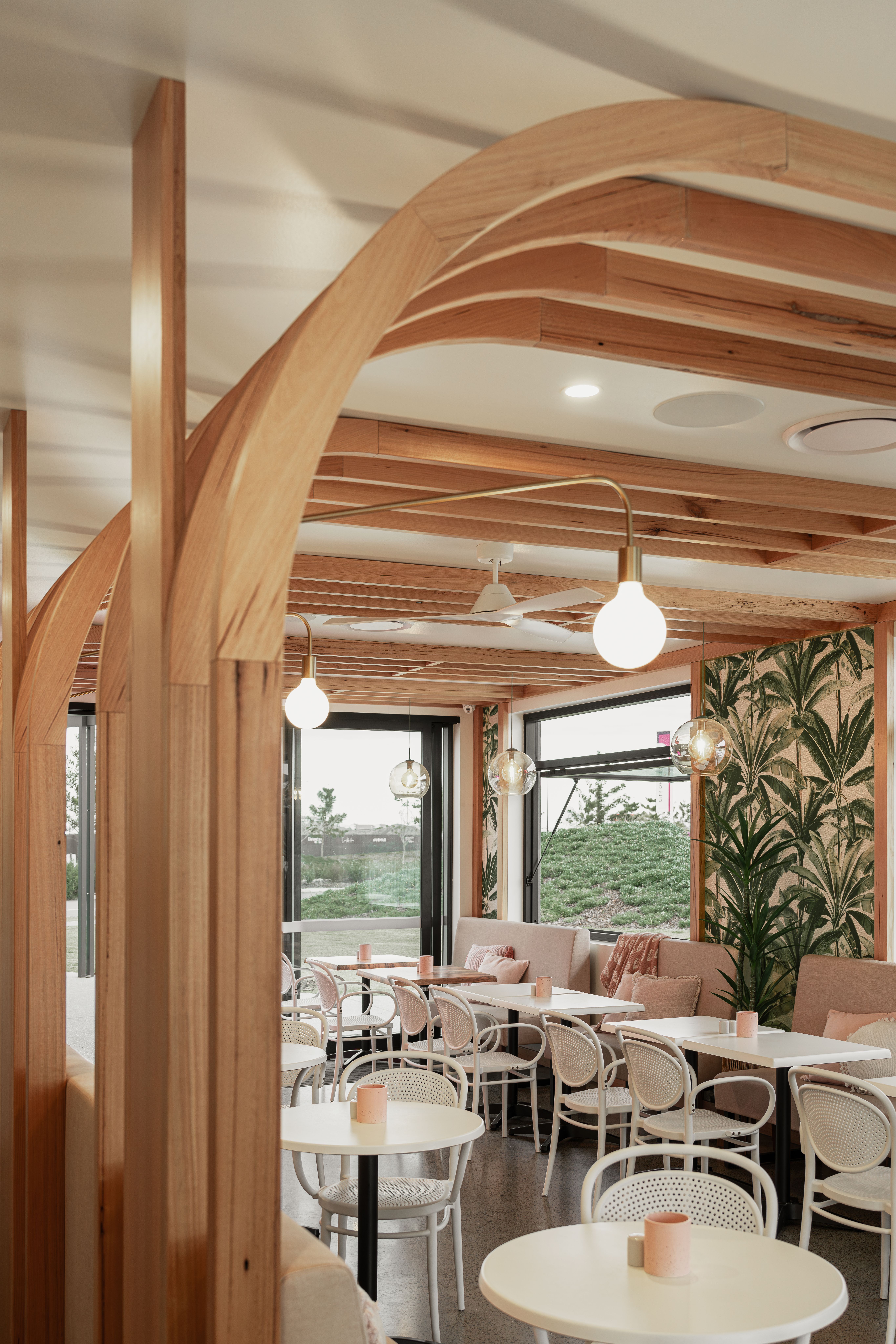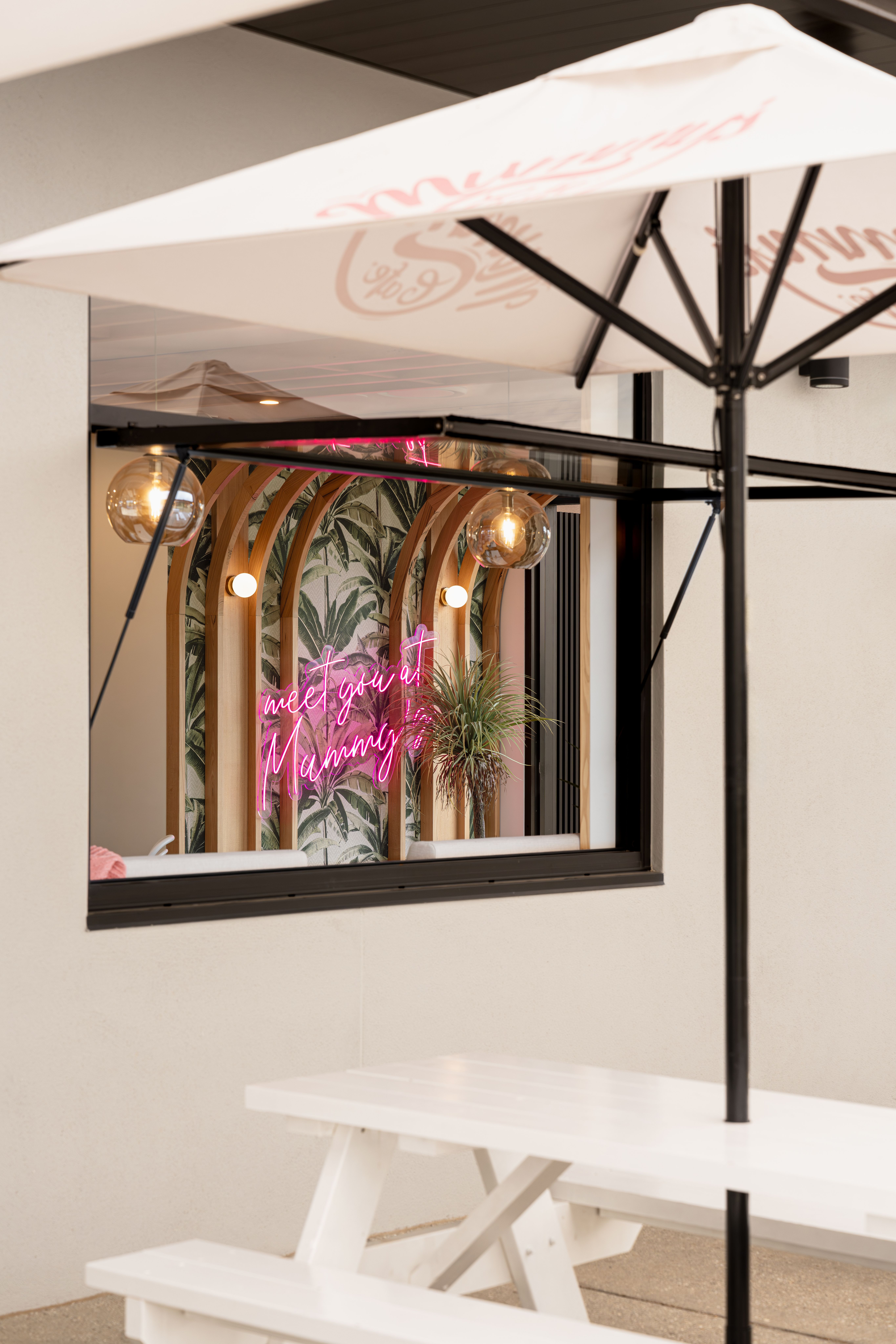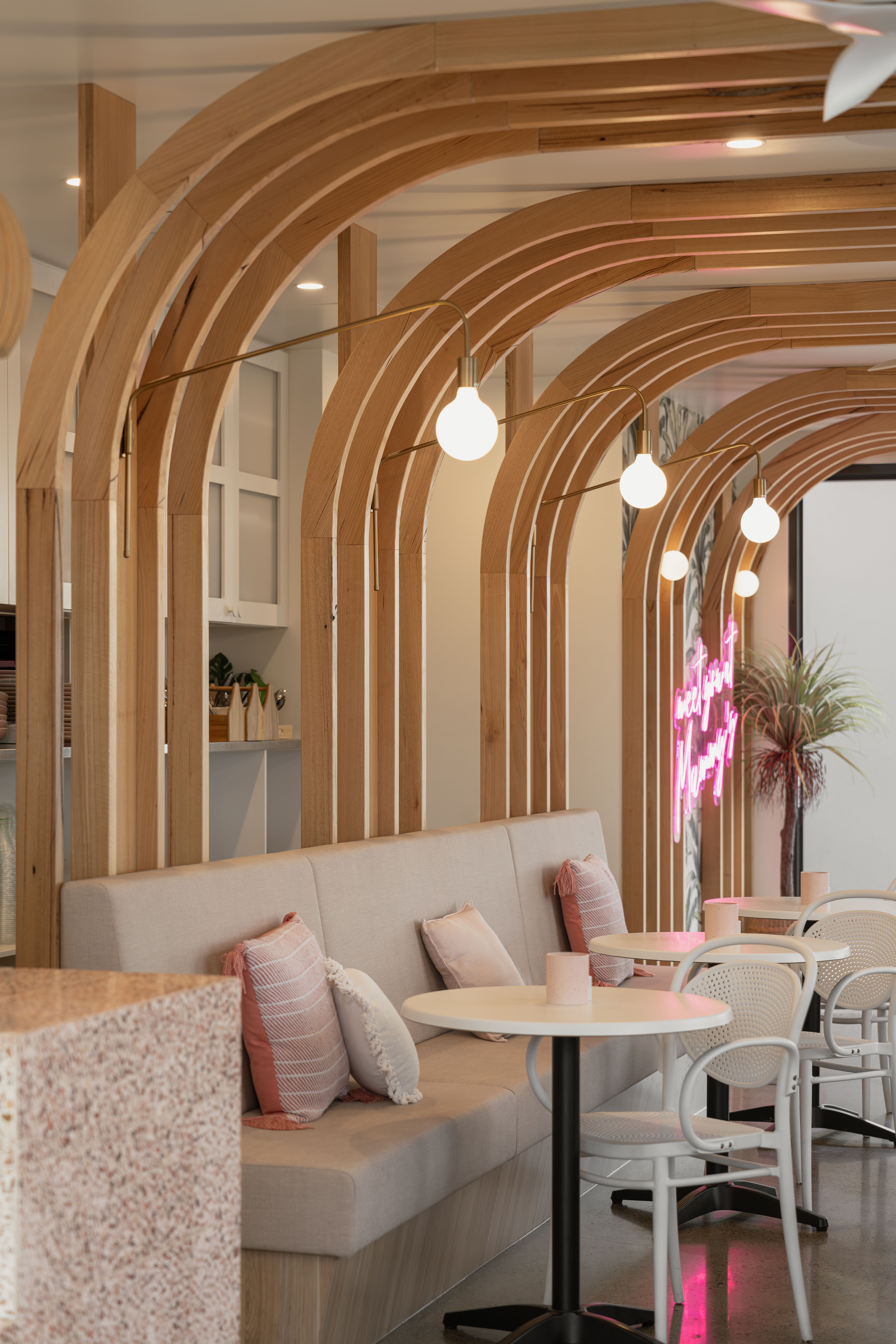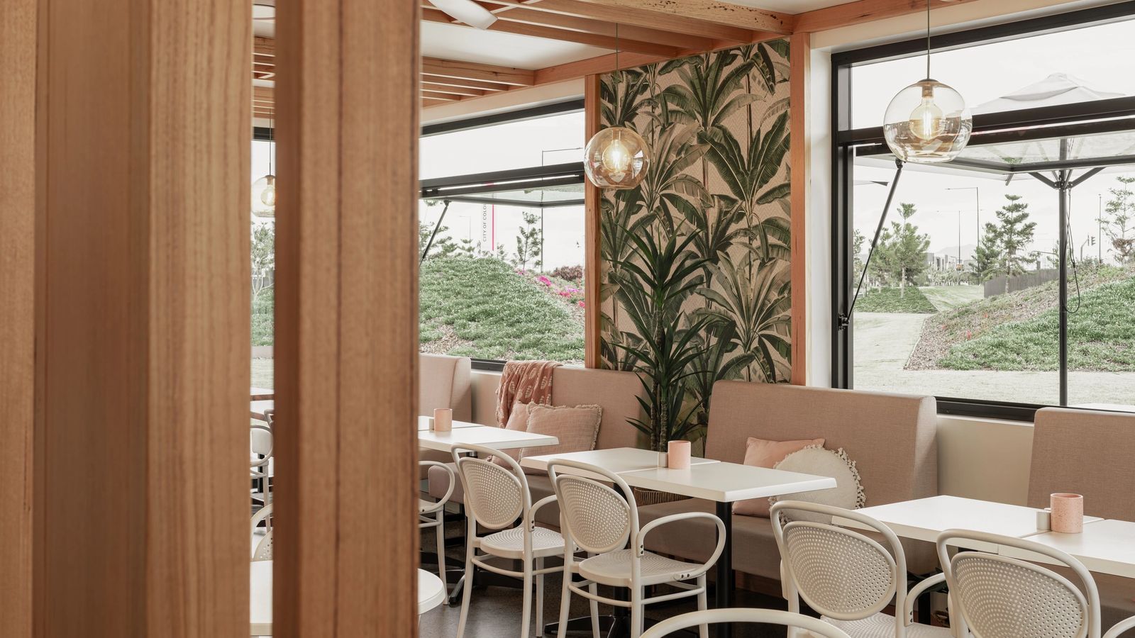 The Mummy's colour palette was well communicated through a terrazzo counter, upholstery, and tropical wallpaper creates the perfect balance in achieving final effect of blush tones, blonde timbers and concrete surfaces supporting the light, airy and busy cafe venue for this fast-growing community to enjoy.