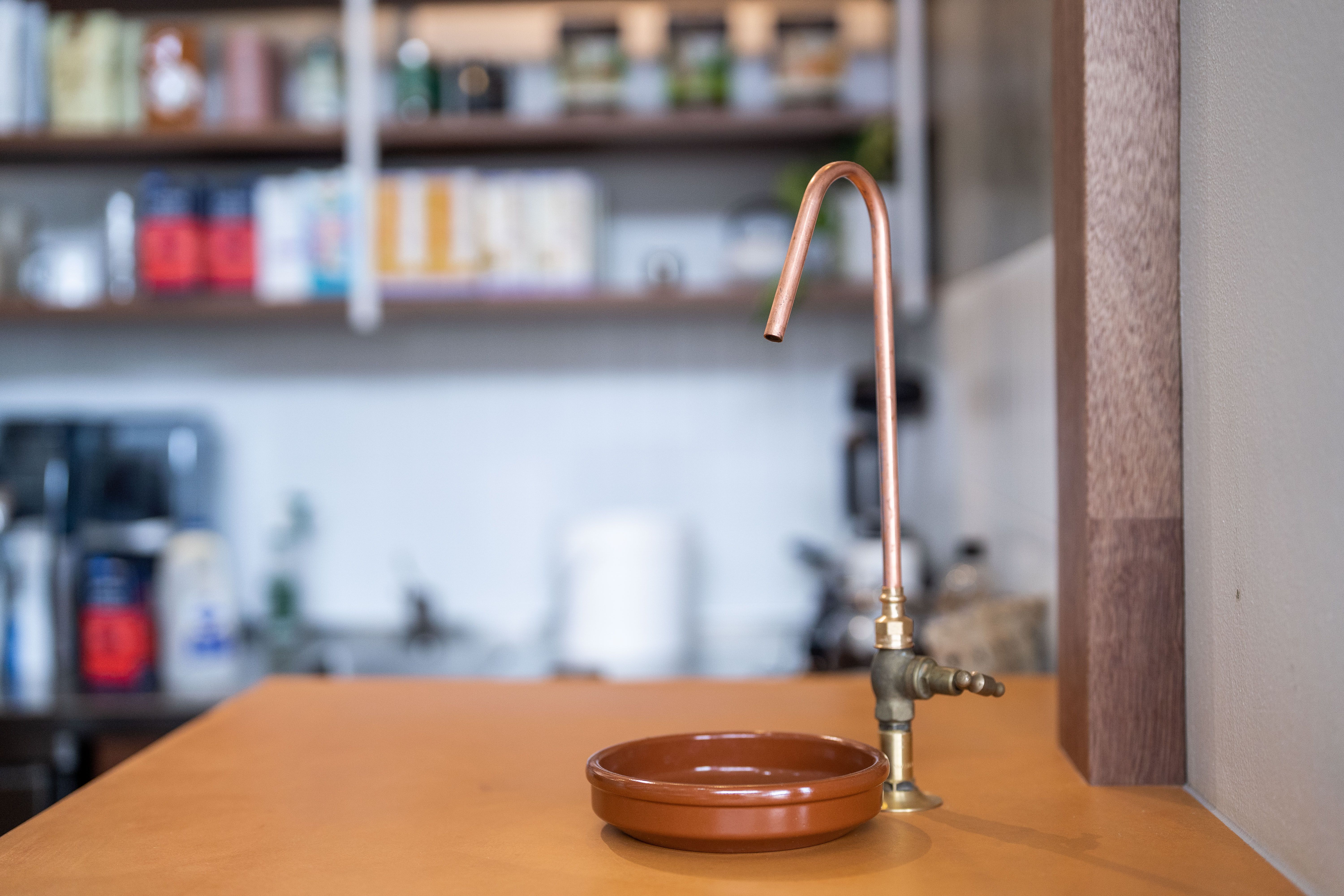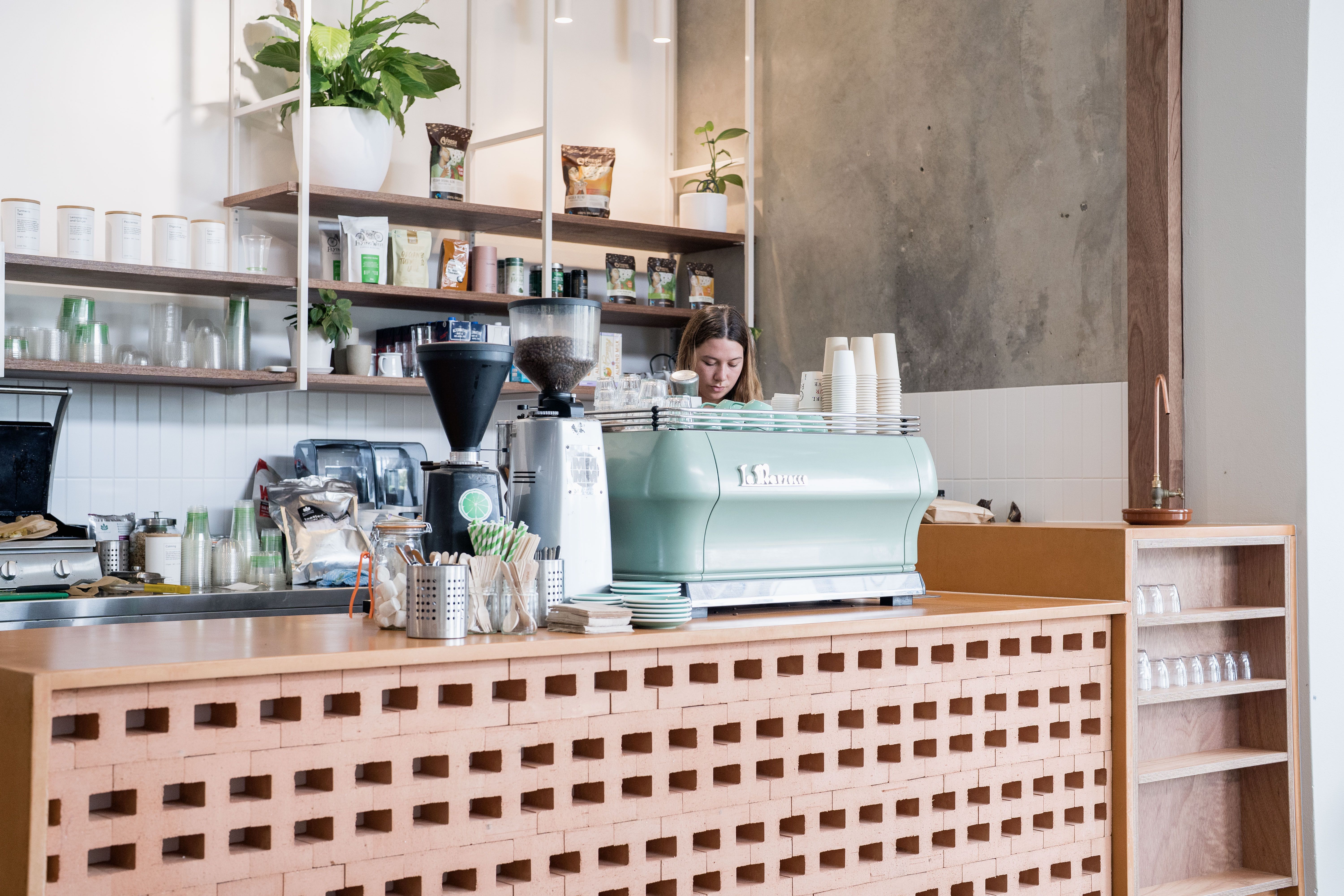 A combination of Terracotta tones using seamless one-piece custom hand-formed and polished concrete tops, clay breeze-blocks and ceramic-glazed tile fascia’s and splashbacks wrap custom stained plywood joinery counters. One-off custom patron furniture was custom fabricated and powder coated to accompany.