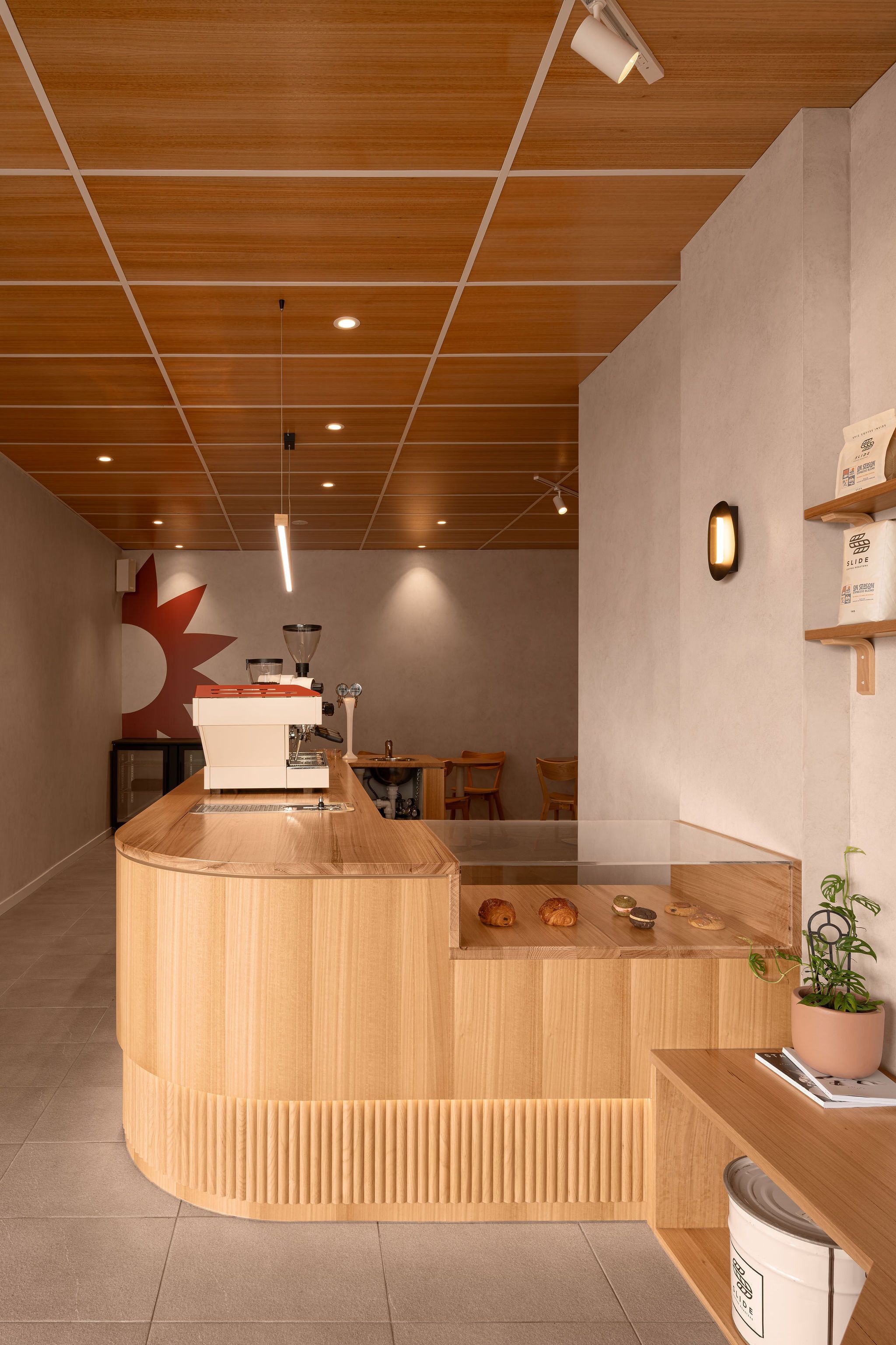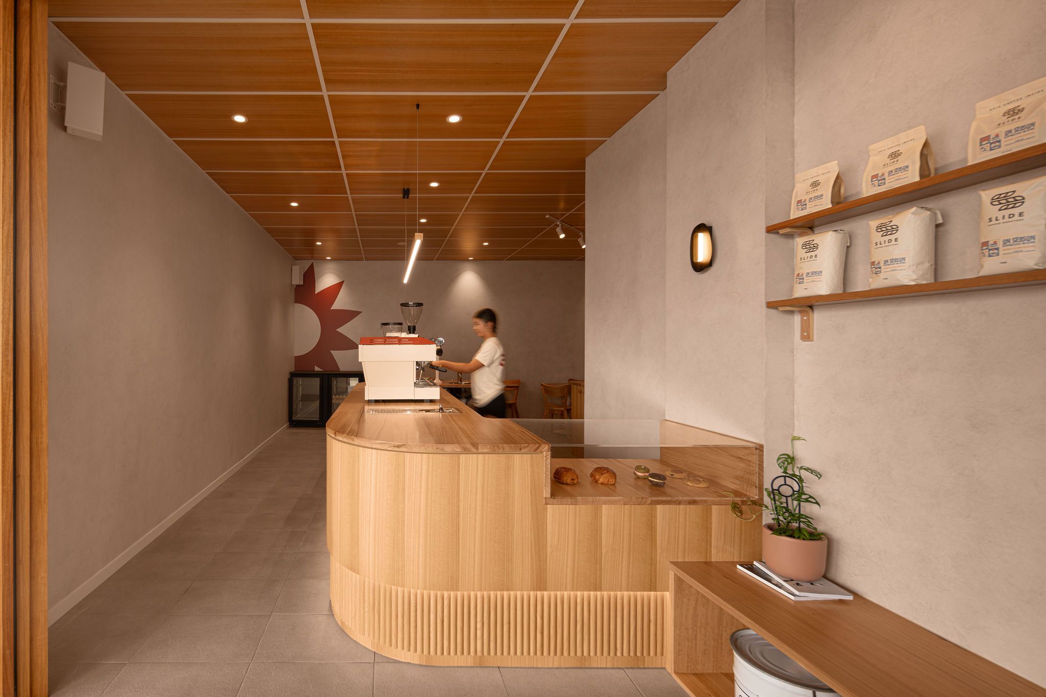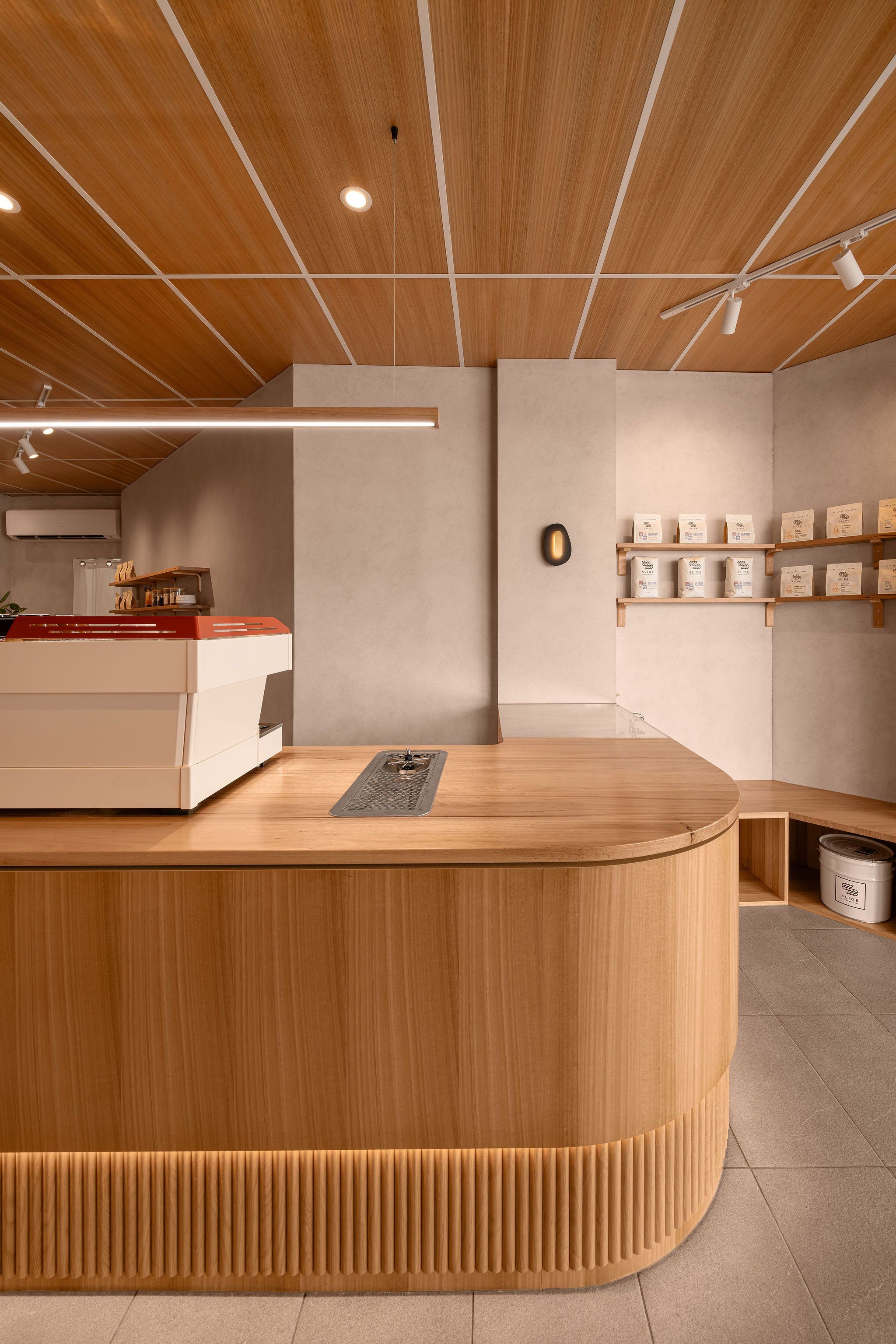 With regards to the interiors, the palette is grounded in natural timber, featured prominently across the ceiling panels, café counter, and custom shelving. These elements establish warmth and texture, counterbalancing the cool neutrality of the existing grey tiled floor.