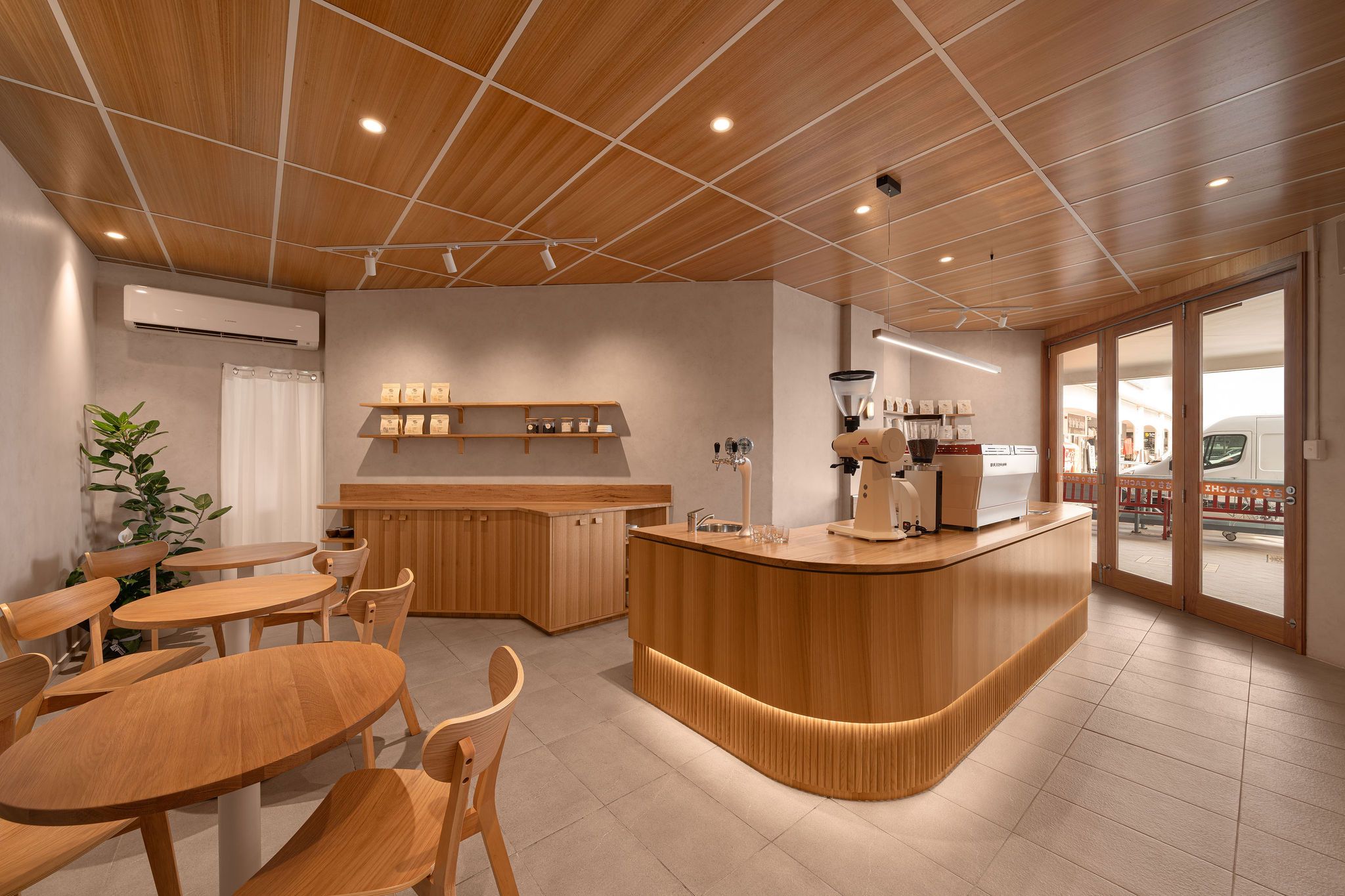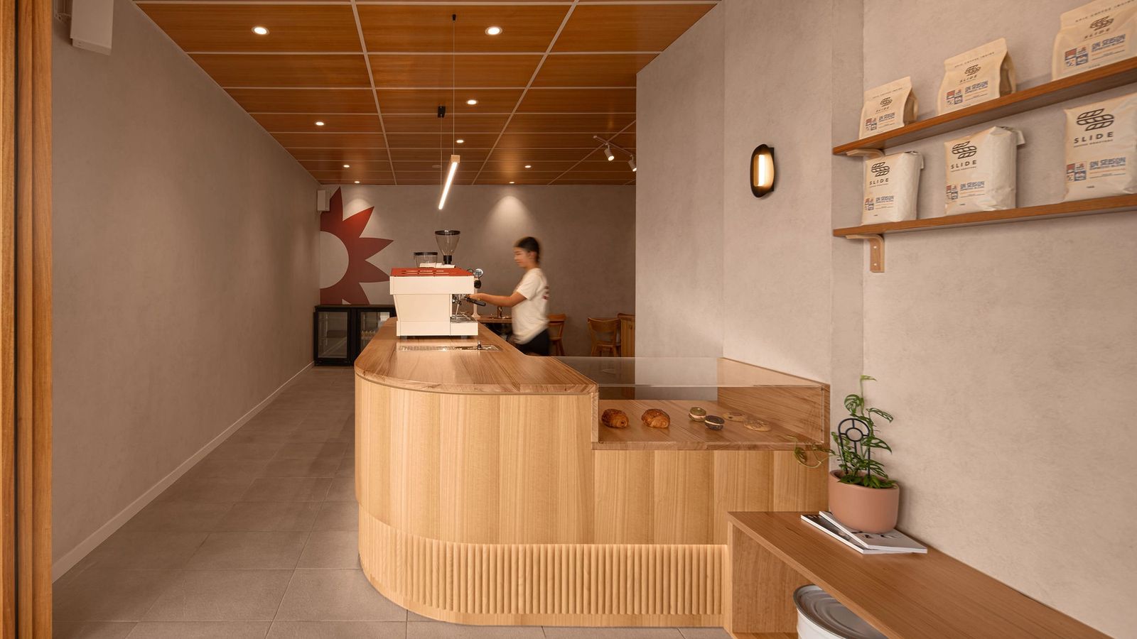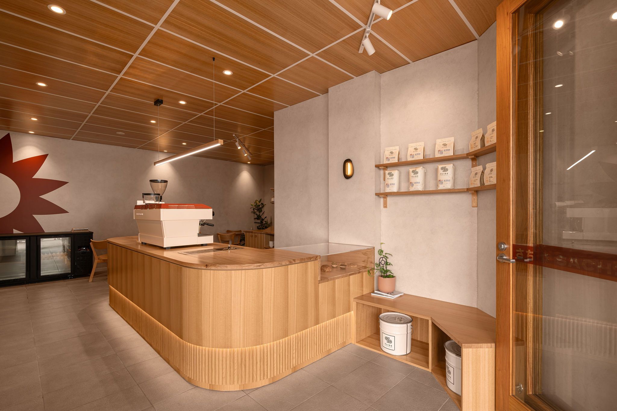 With regards to the interiors, the palette is grounded in natural timber, featured prominently across the ceiling panels, café counter, and custom shelving. These elements establish warmth and texture, counterbalancing the cool neutrality of the existing grey tiled floor.