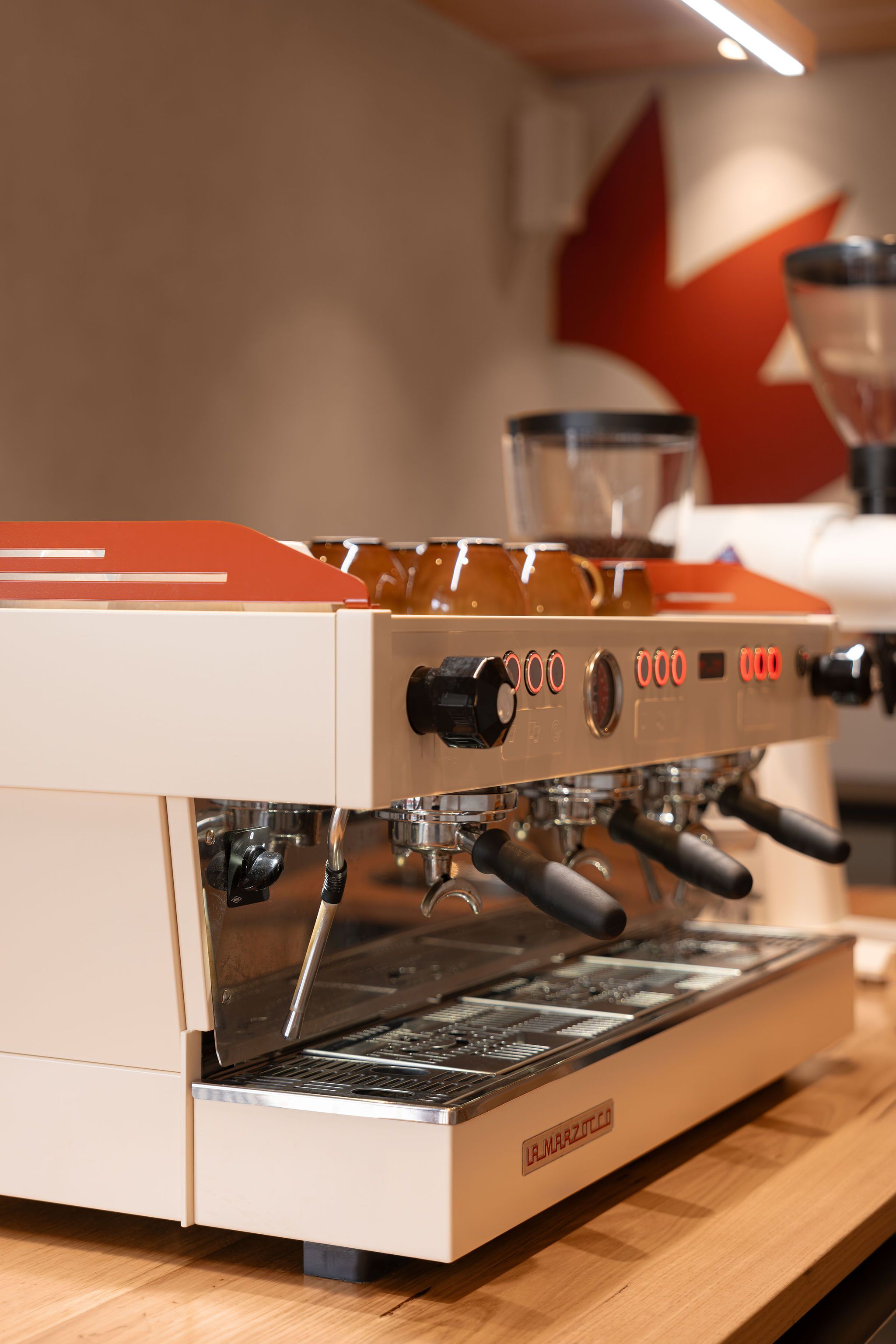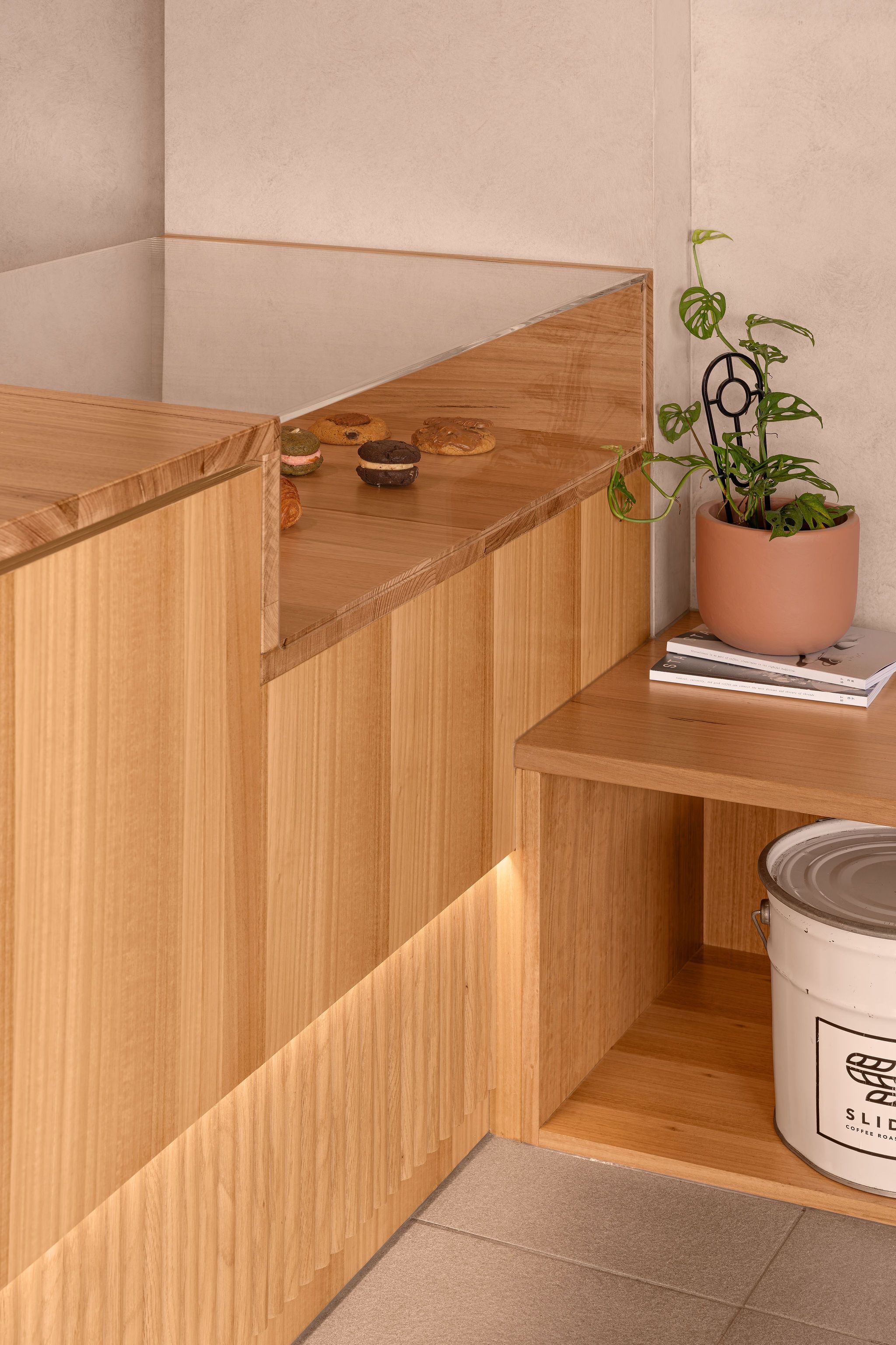 Planning and designing within a tenancy defined by angled walls posed a unique spatial challenge. Rather than fight the geometry, we embraced it—crafting a custom café counter that responds to the angled layout while maintaining a clear workflow for baristas and intuitive customer movement.