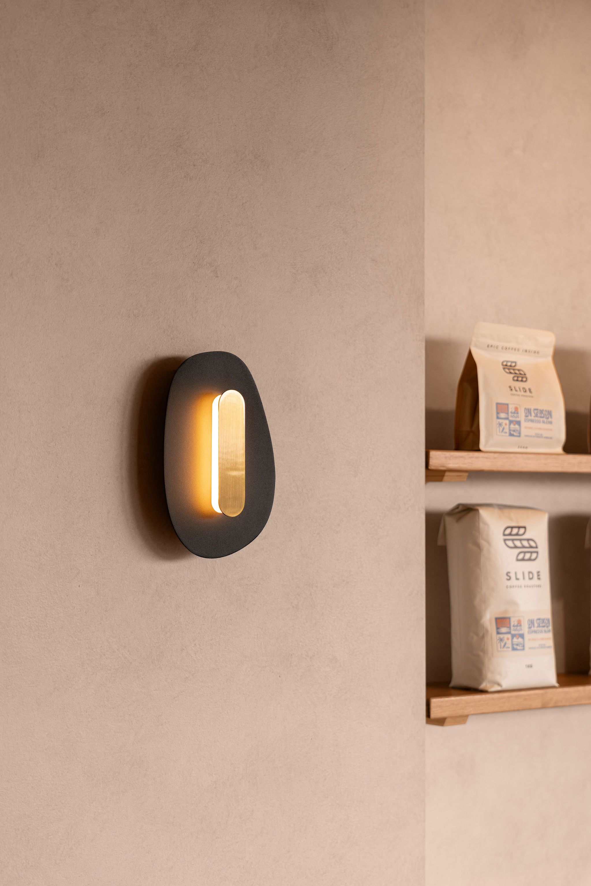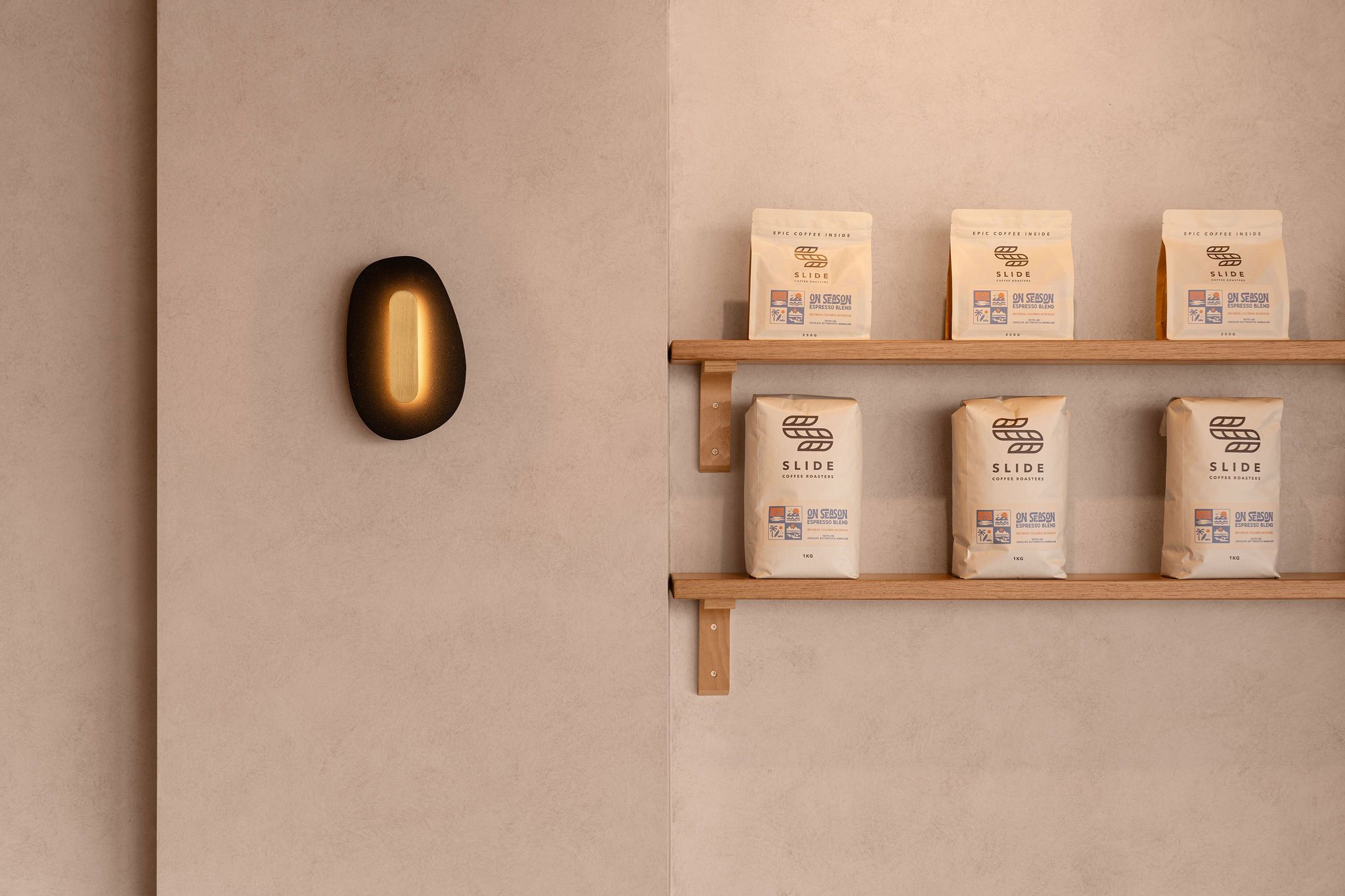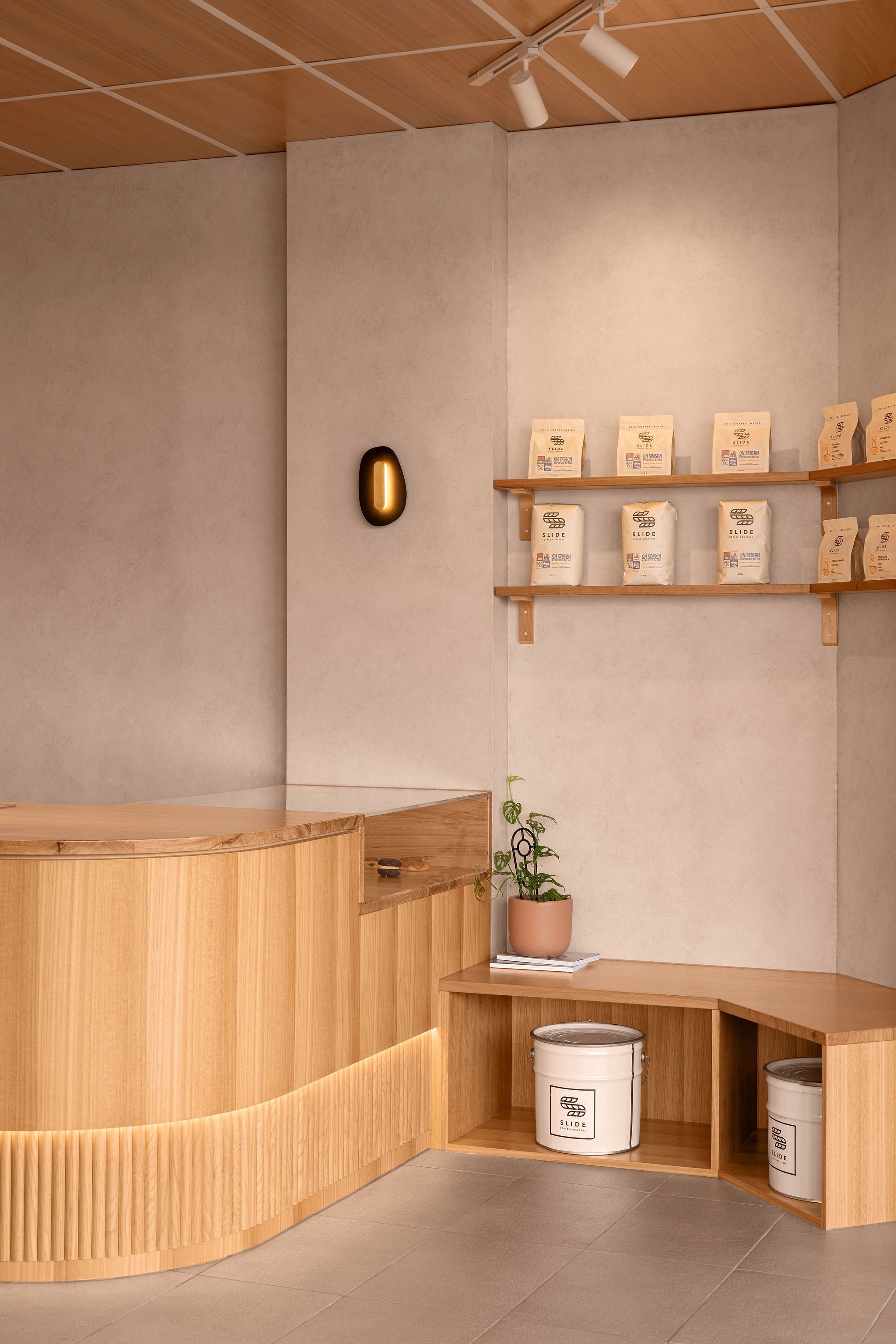 To soften the space and introduce visual depth, the tenancy walls are finished in specialty paint creating a gentle, textured backdrop while complementing the tonal palette of timber and stone