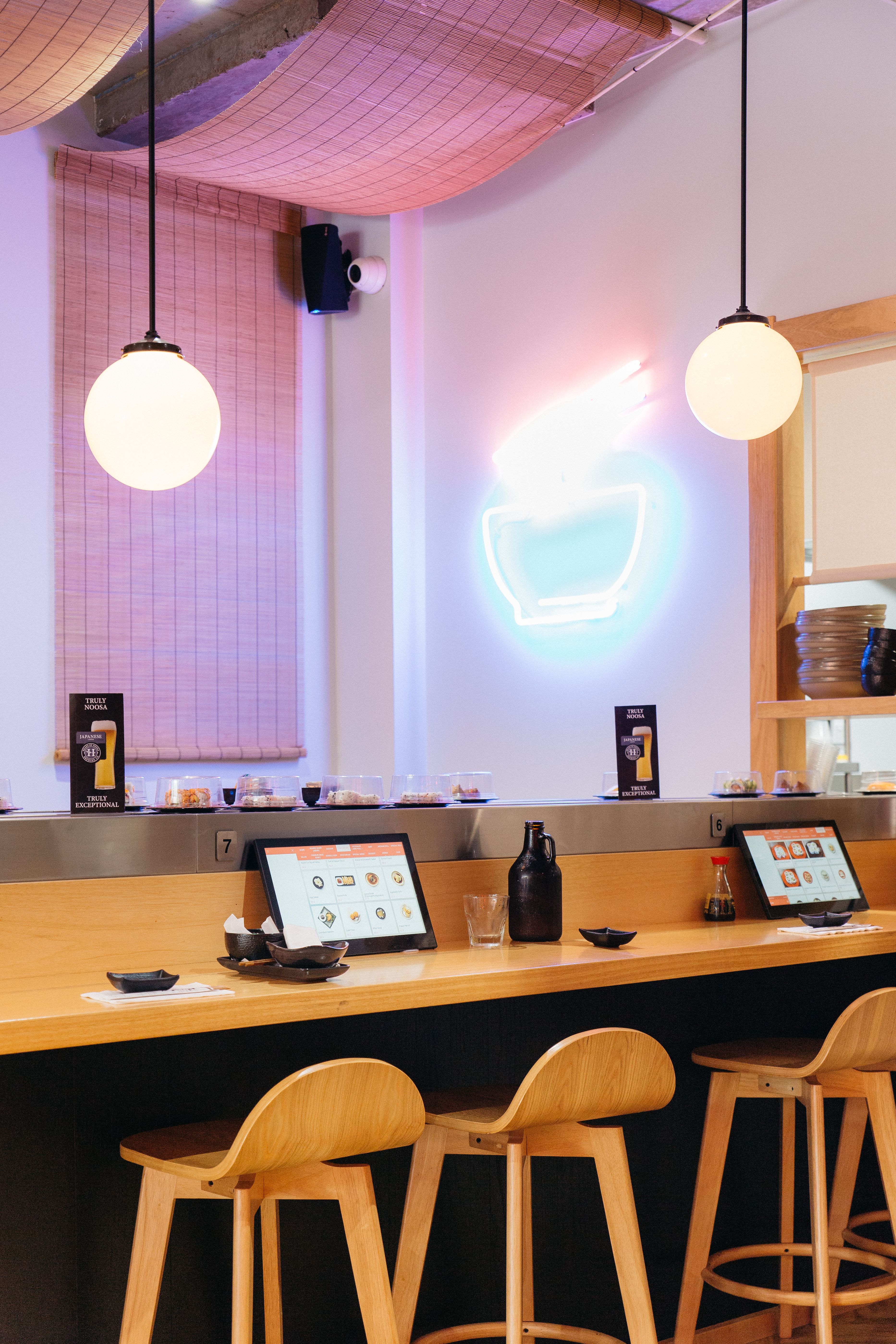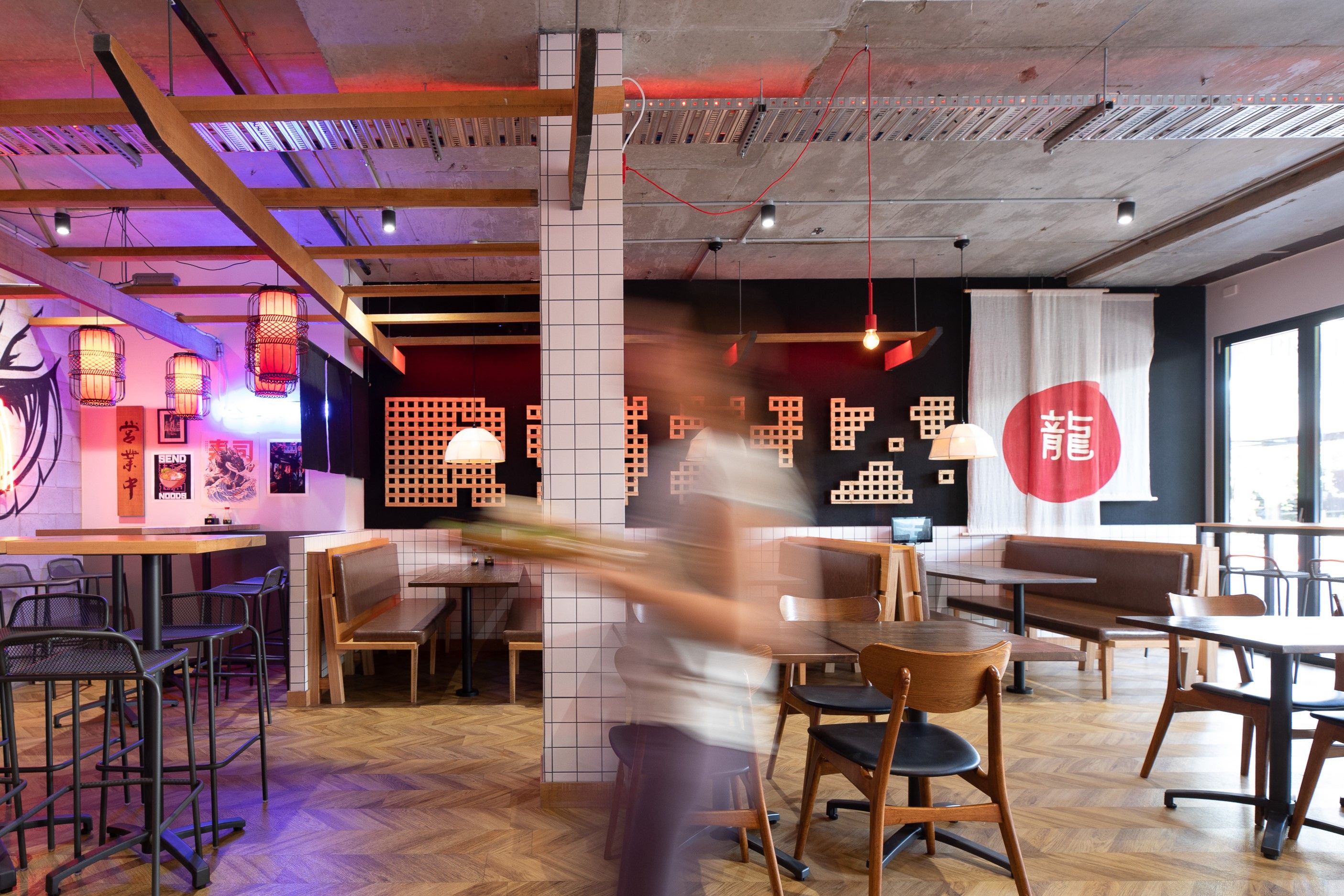 Materials included timber screens, parquetry, and browns and greys – taking inspiration from the design vernacular of both Chinese and Japanese cultures to fit with the menu on offer. Bringing the brand strategy within scope collaboratively offered a offered a holistic approach to the venue design and identity.