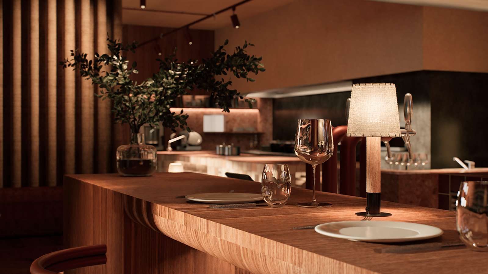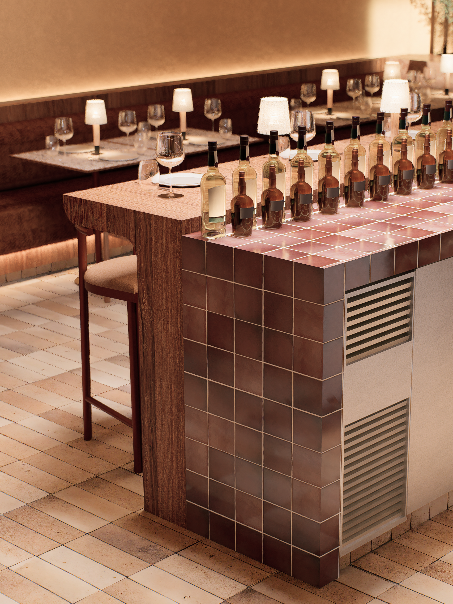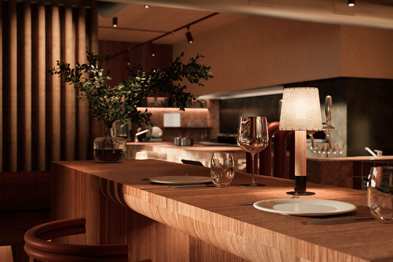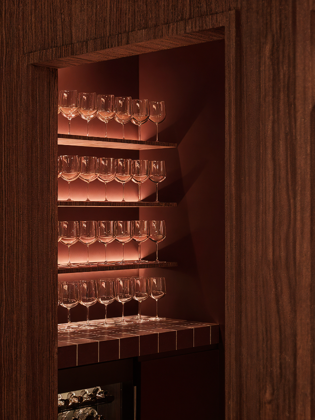 Split by a service pathway through the middle that connects a beeline of bar, kitchen pass and back of house, fading through the concealment of the latter in the form of integrated wine cellaring alcove.
