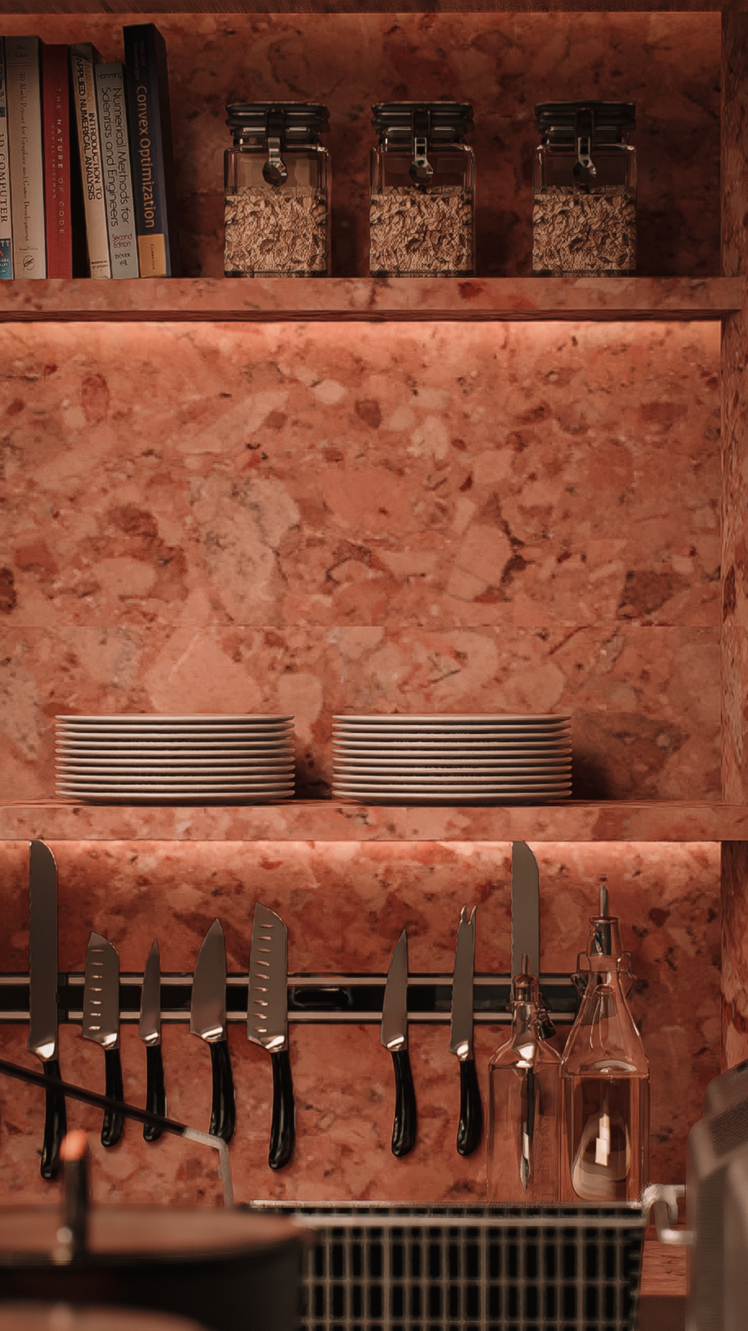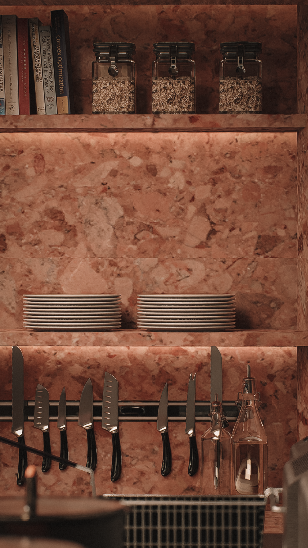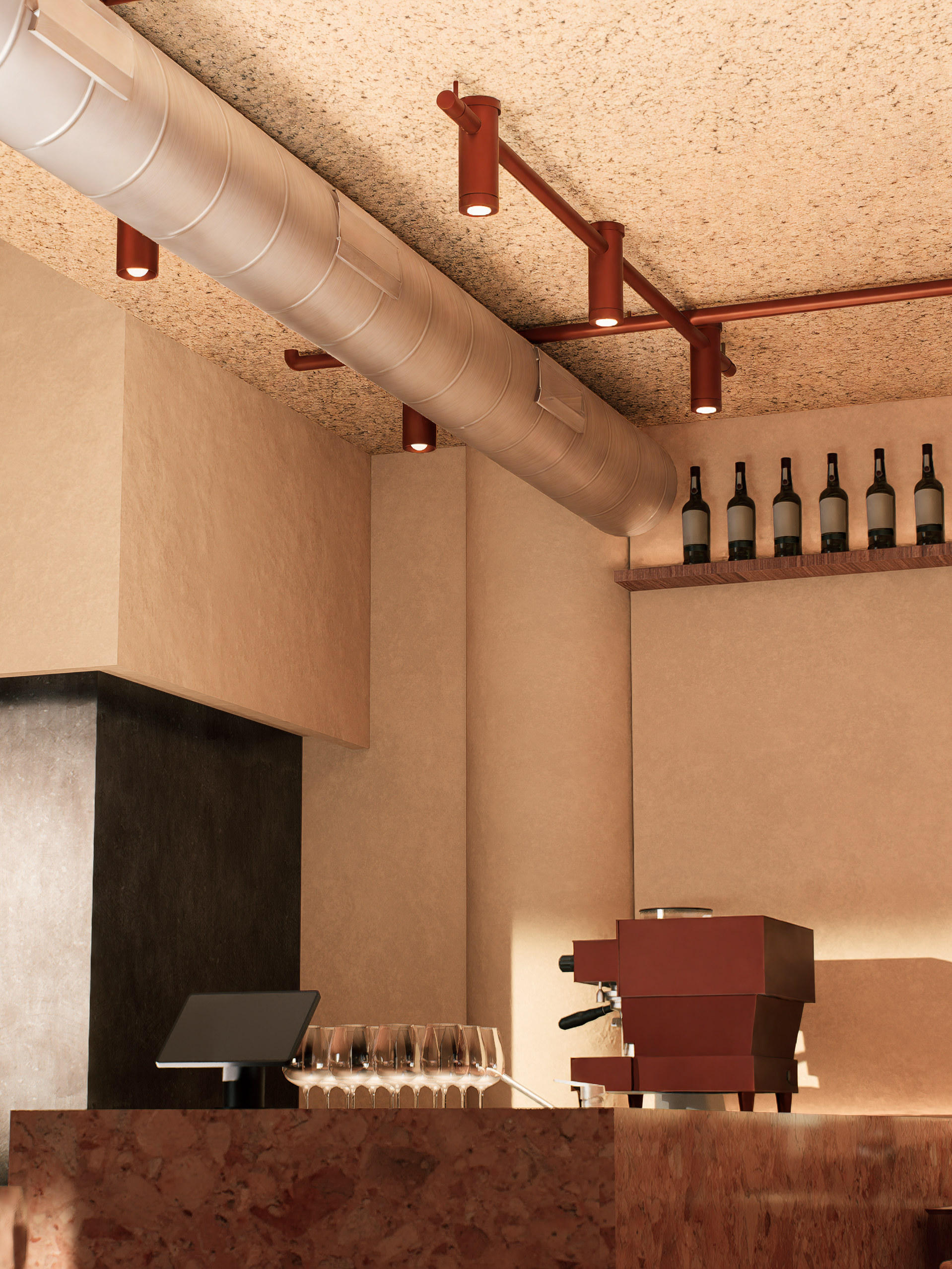 Split by a service pathway through the middle that connects a beeline of bar, kitchen pass and back of house, fading through the concealment of the latter in the form of integrated wine cellaring alcove.